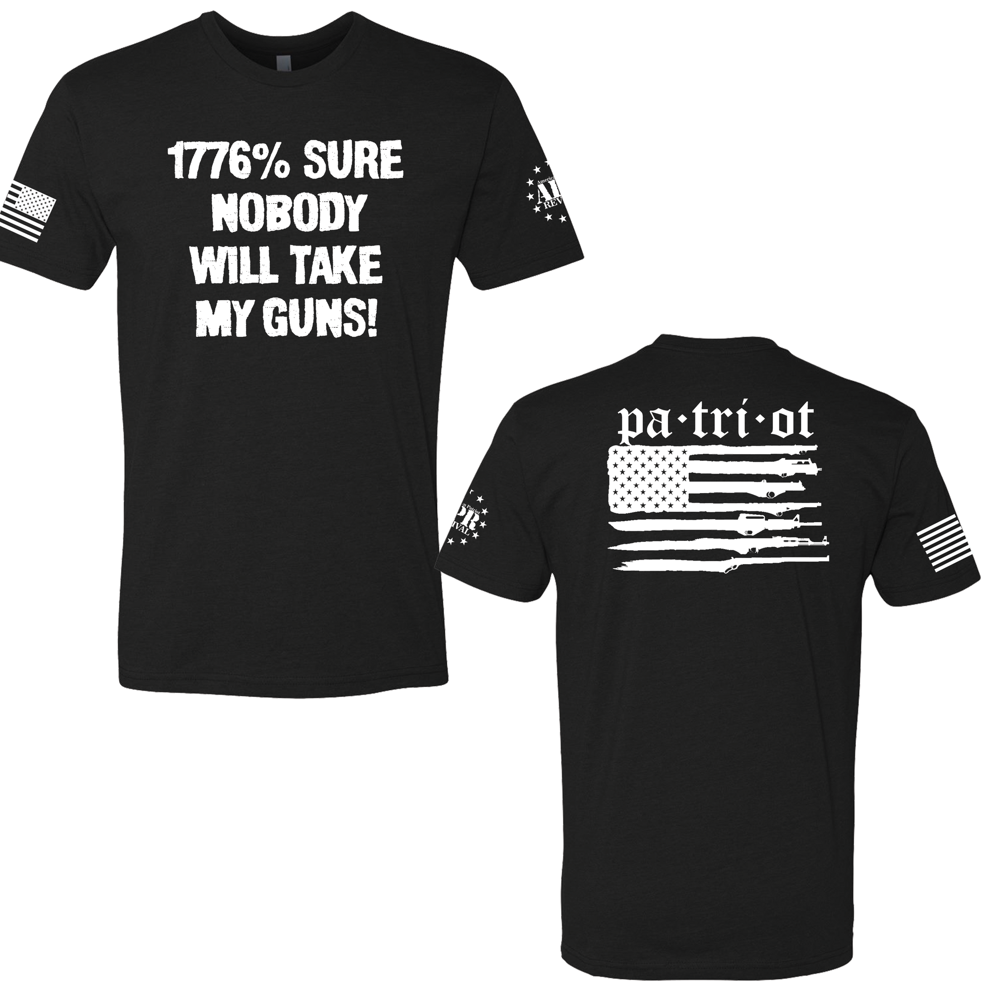 This tee shirt makes a bold statement against gun control with the phrase "1776% sure nobody will take my guns" printed on the front. This design pays homage to the year of America's independence and declares a steadfast belief in the right to bear arms. Made from soft and comfortable 60/40 cotton/poly blend, this shirt is perfect for any proud gun owner who wants to make a statement about their rights. This tee shirt is perfect for wearing to gun shows, protests, or just around town as a reminder that the Second Amendment is still an important part of American freedom. Whether you're a long time advocate for gun rights or just starting to take an interest, this tee shirt is sure to start conversations and spark debate.