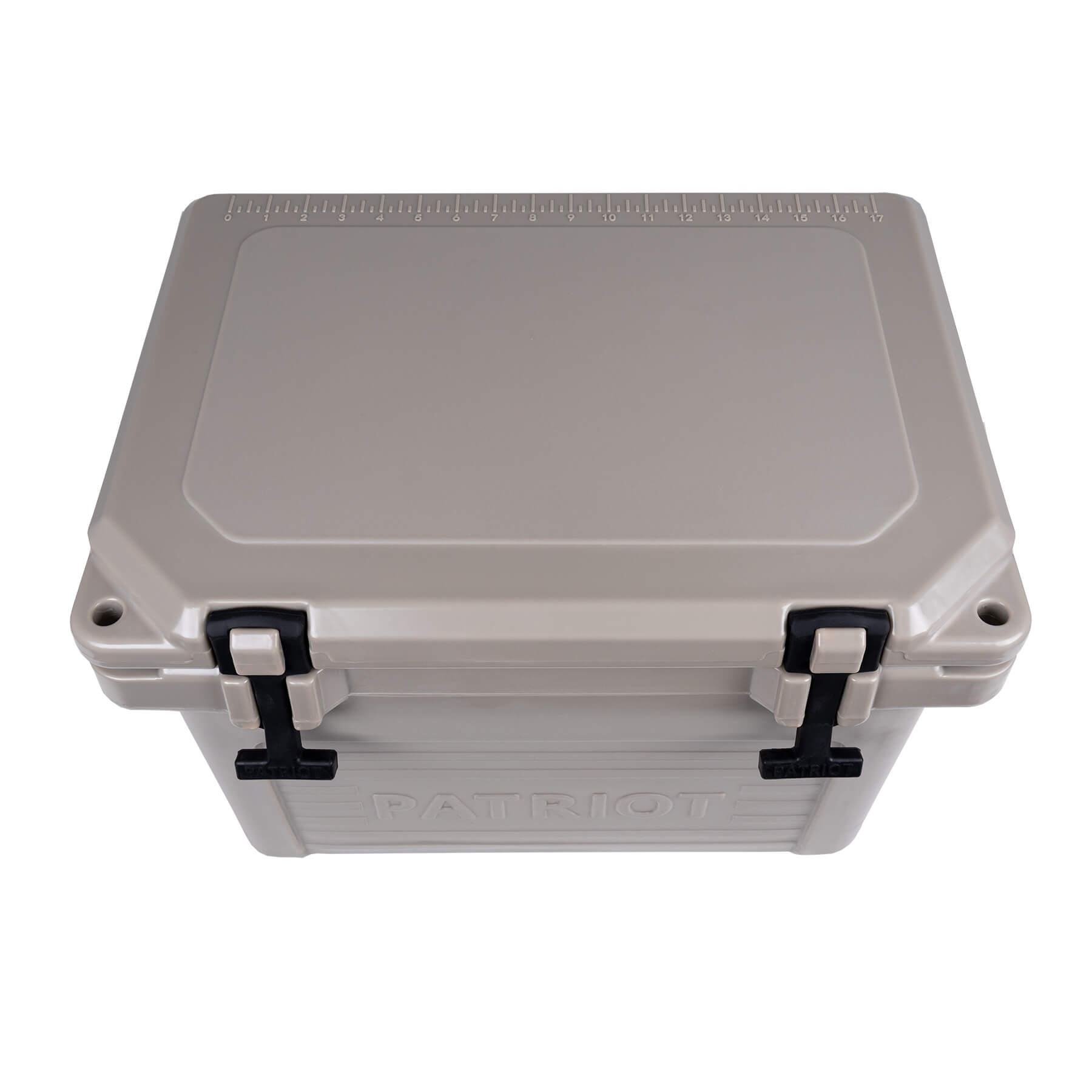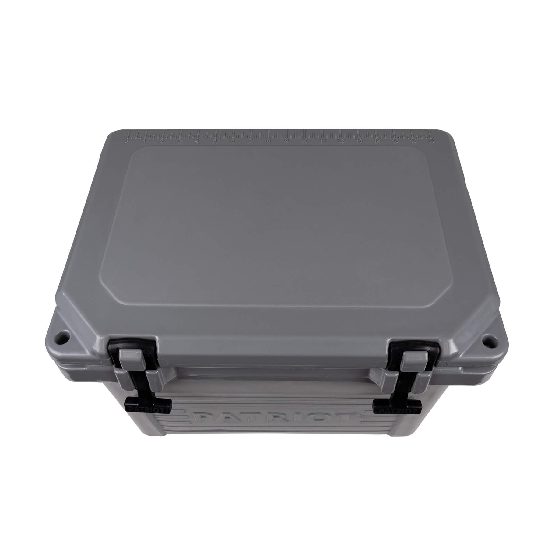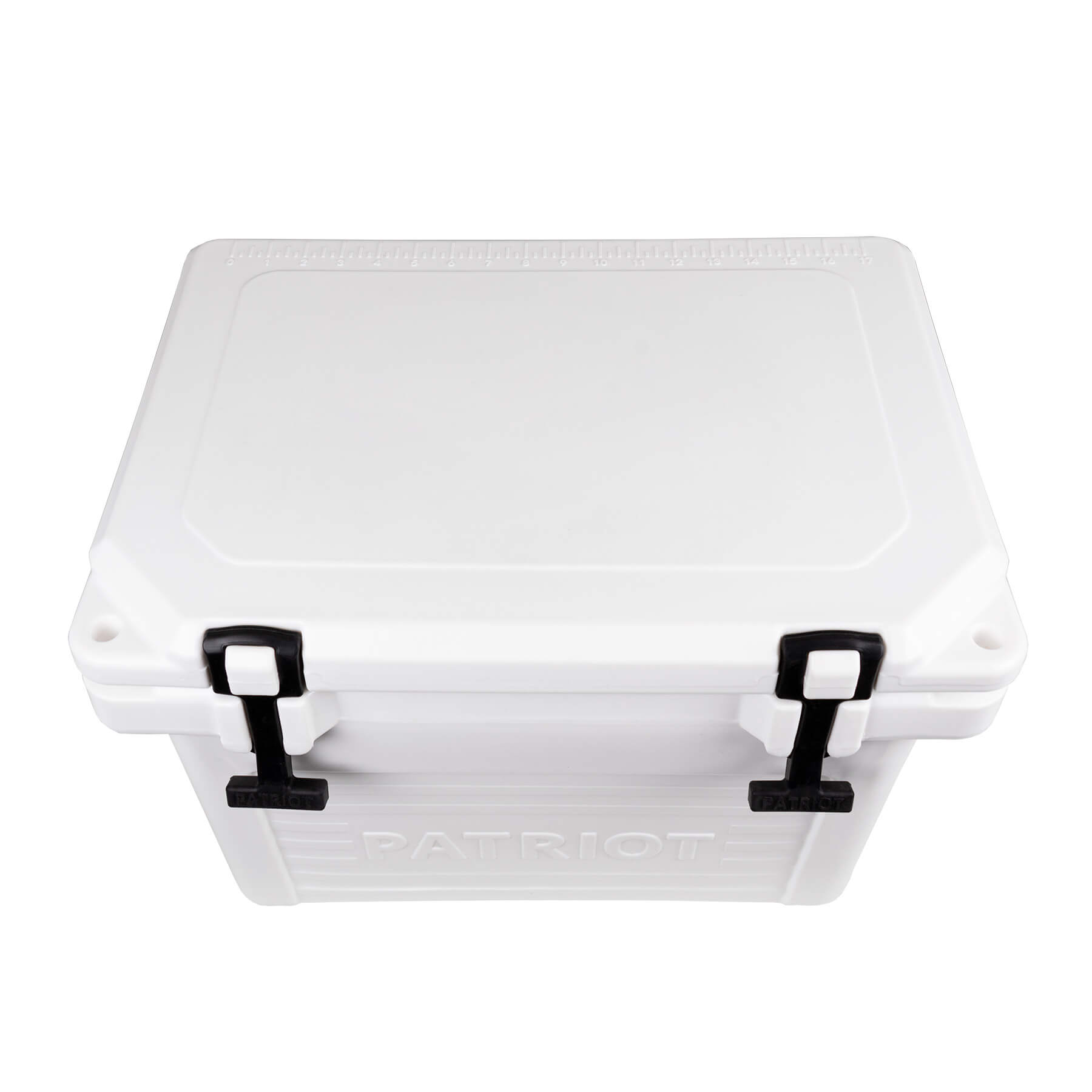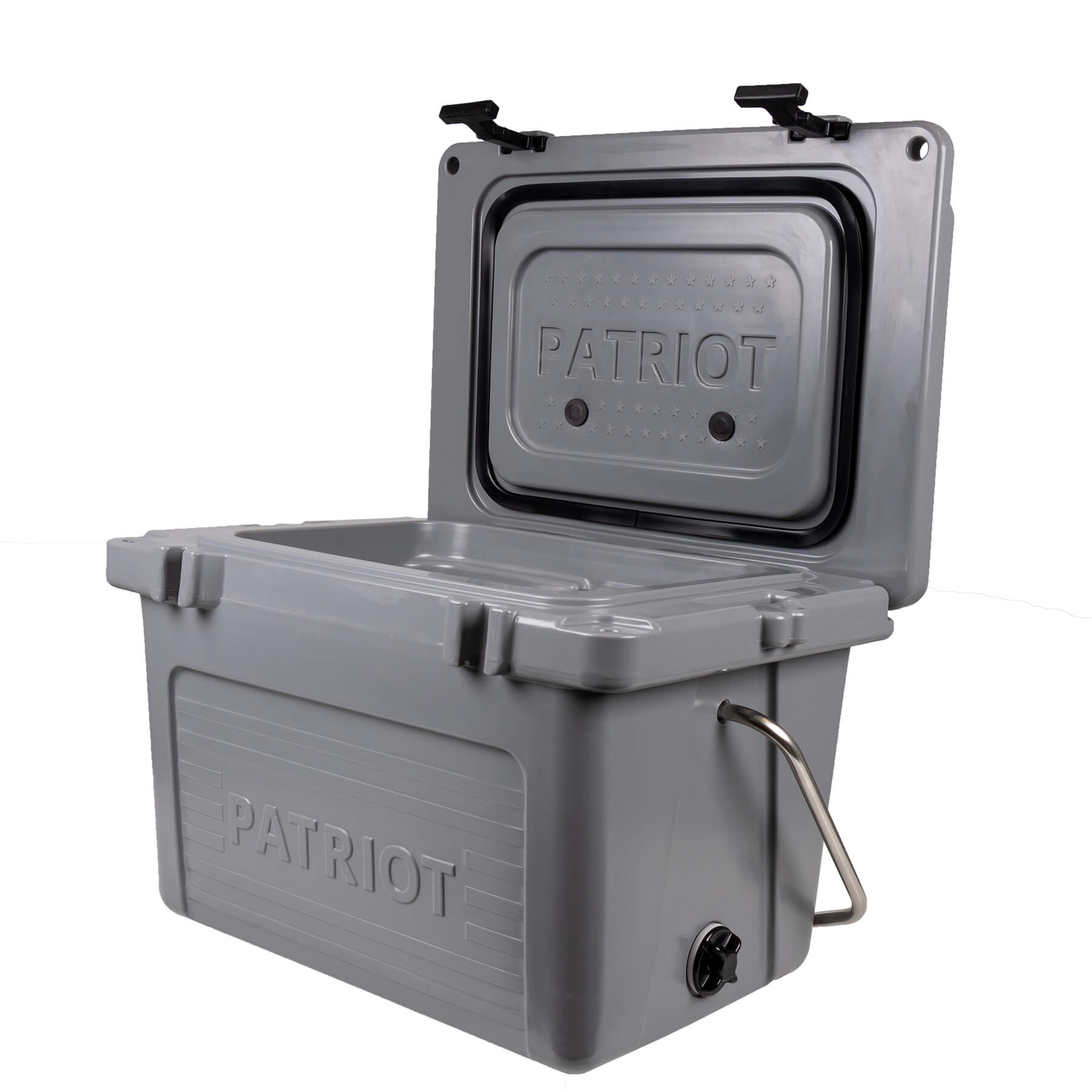 Patriotic design with 13 stripes across the side and 50 stars in the lid