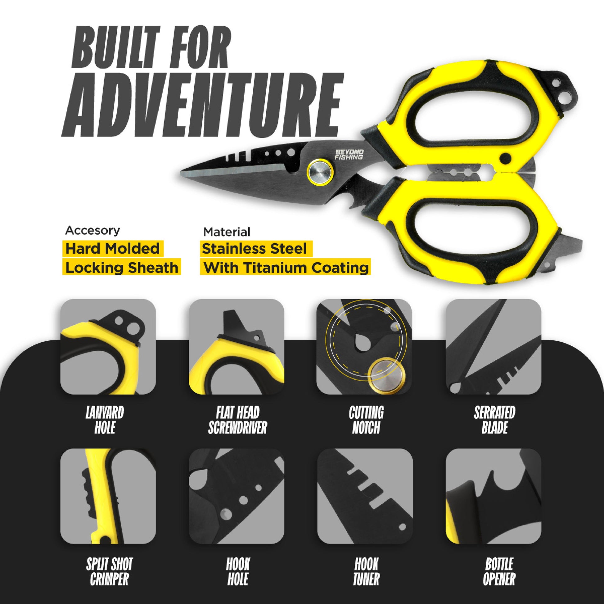 MULTI-FUNCTIONAL DESIGN - More than just fishing scissors, these shears are a true angler’s toolkit. Featuring a split shot crimper, flathead screw driver, bottle opener, and hook eyelet tool, the OmniPro Shears replace multiple tools in one compact, versatile solution.