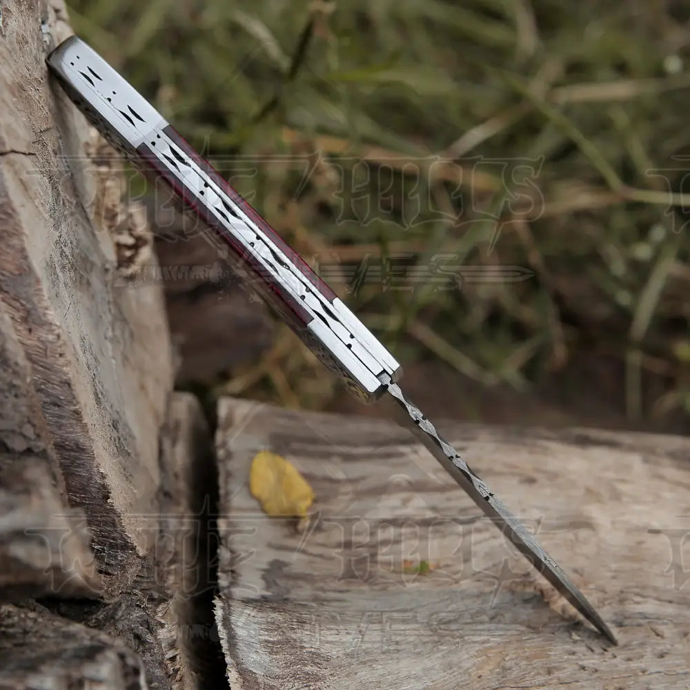 Getting this knife a vintage edge, its handle matters the most. The sleek looking green pocket knife has a compact design and incredible grip on holding. It carries a 4.8" Inches handle crafted with durable green dollar sheet with beautifully engraved steel framework. The stainless steel clips and a classy file work on the spine adds to its alluring look.