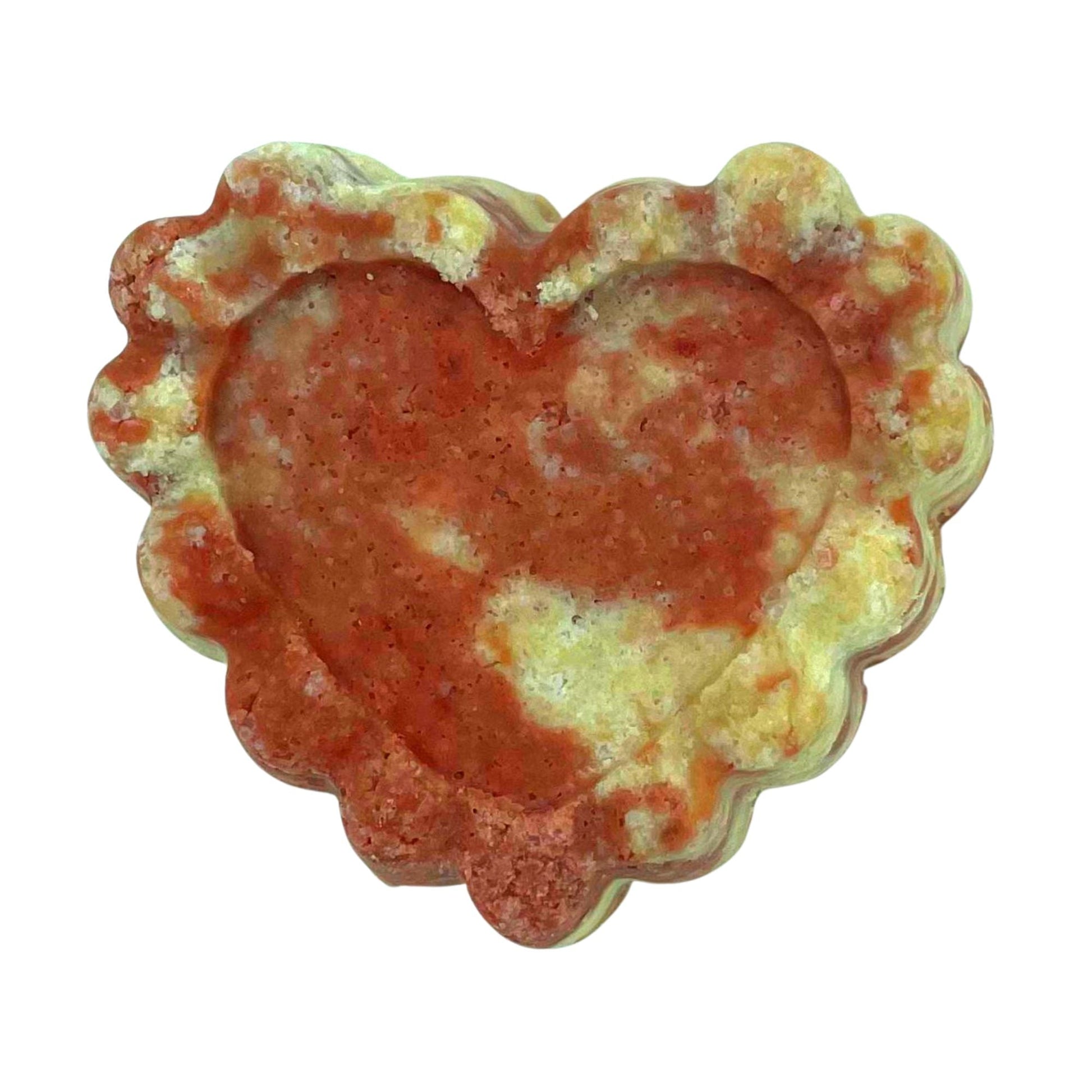 A Hot Pink Mess Bubble Bomb creates the perfectly scented bubble bath for one or two! Made in a convenient heart-shaped puck, they are perfect for romantic getaways without a possible mess all over your luggage. Just put half or all of the heart under hot running water at water level to experience an initial fizzy bath bomb that turns into a luxurious bubble bath! Each one is handmade with moisturizing shea and mango butters to soften and pamper the skin, and 100 percent pure essential oils that sensually perfumes the skin. Like all of our bath and body products, they are completely natural, use only sustainable ingredients, and are gluten-free. These are also vegan. The scent is sweet, warm, and spicy. Check out this same scent in our fizzing bath bombs too!