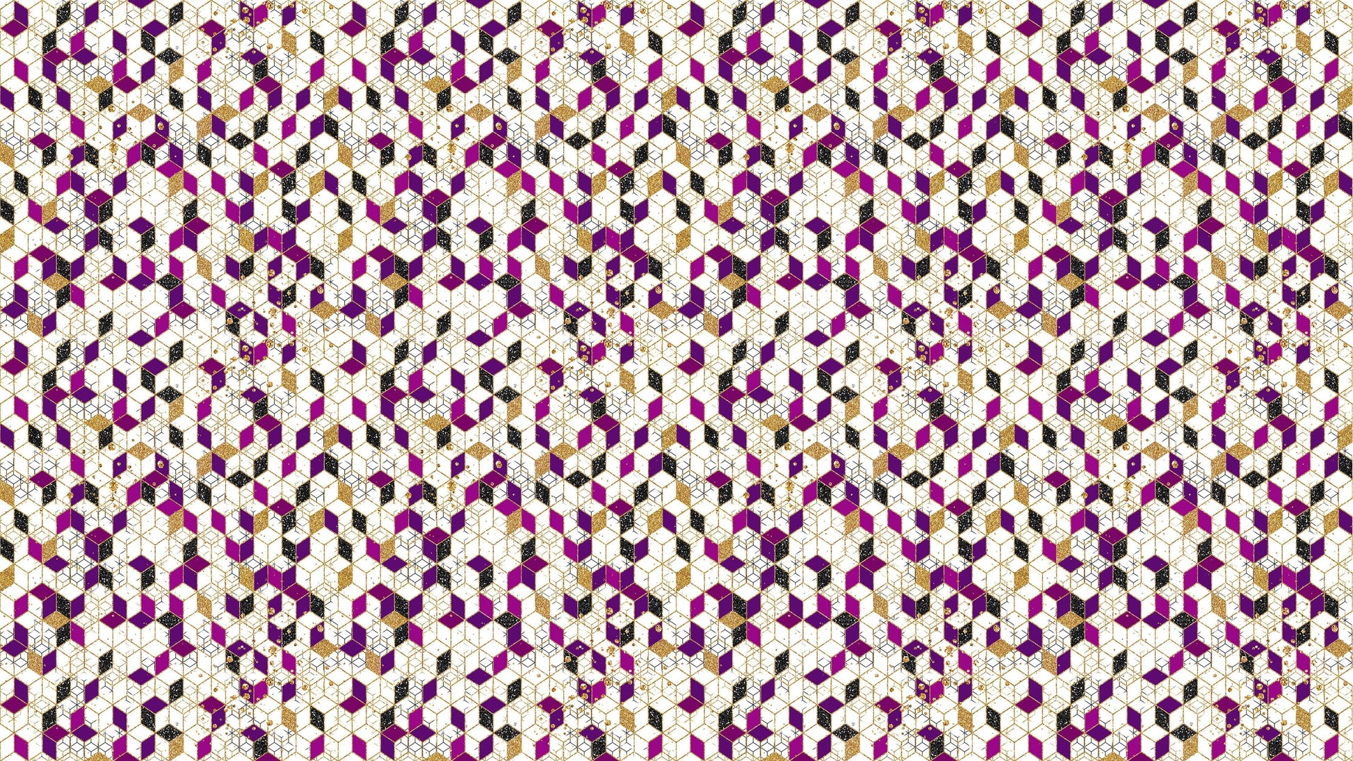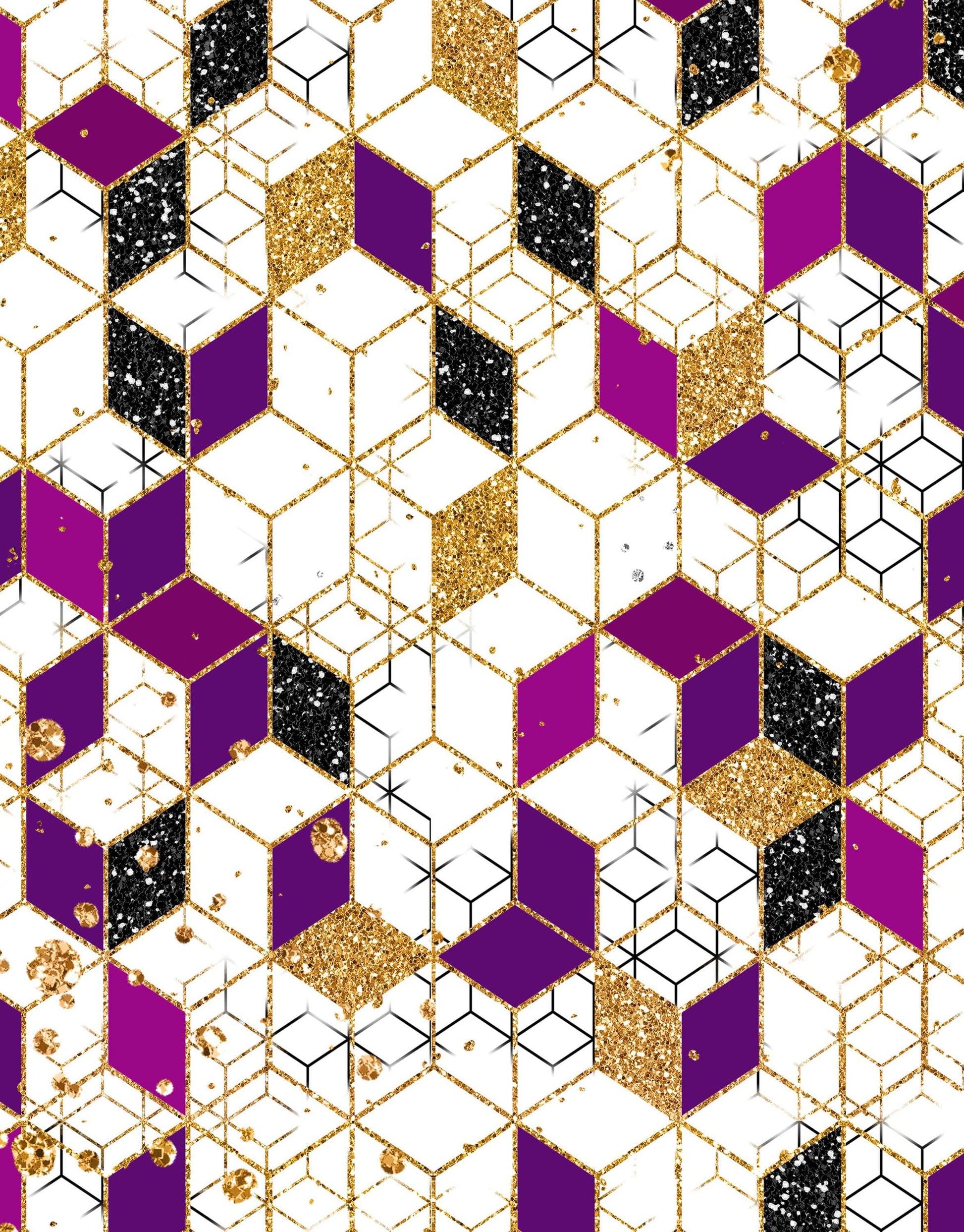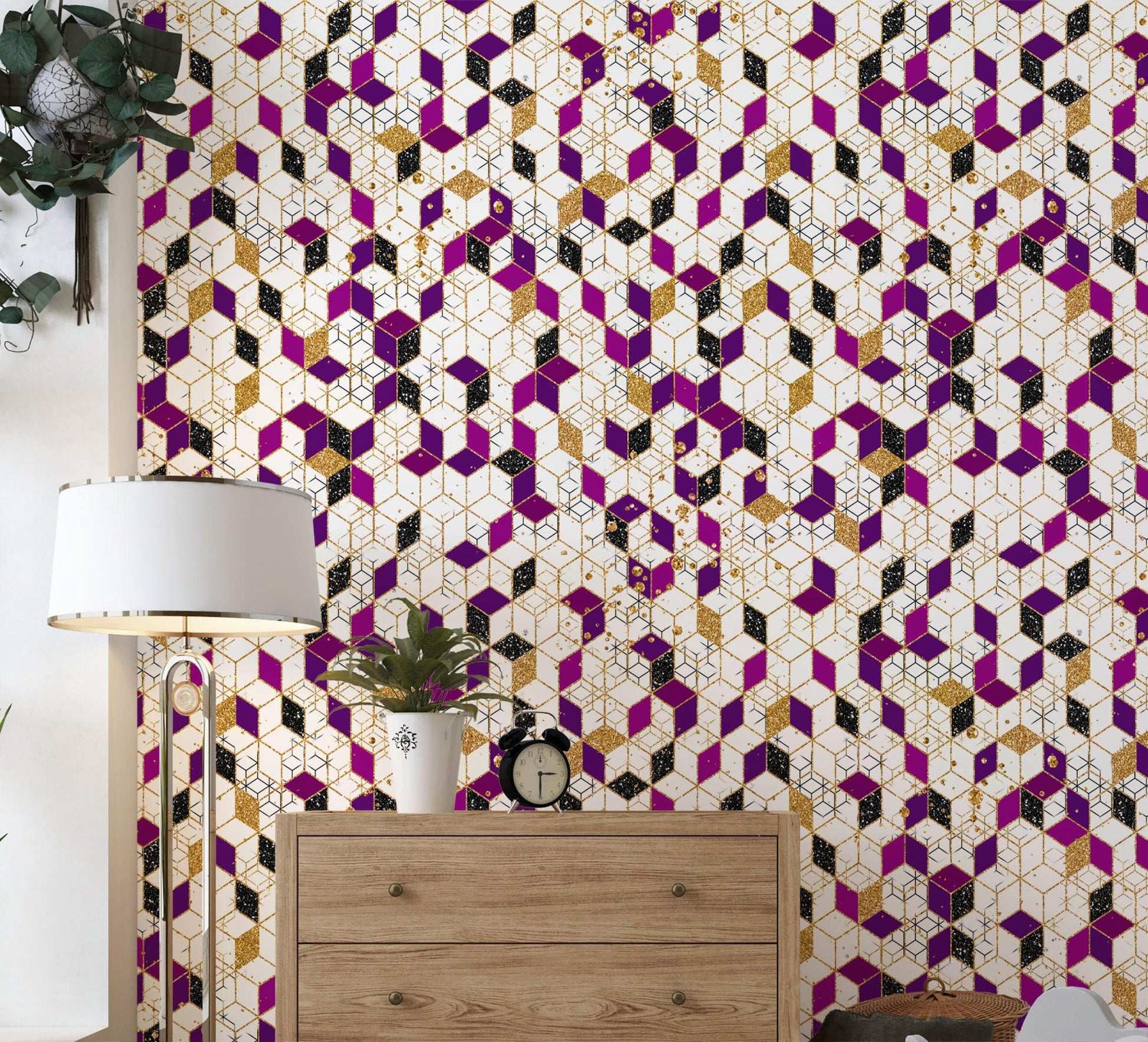 Abstract 3D Cube Shape Wall Mural. Geometric Cube Minimalistic Purple and Gold Peel and Stick Wallpaper. #6380