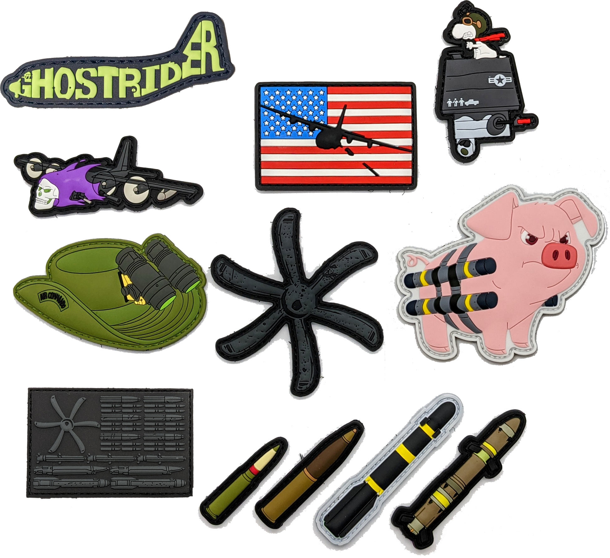 Ghostrider Bundle Includes 12 Patches : Bullet Flag, AC-130 Flag, 6-Blade Prop, 105mm, 30mm, AGM-114, AGM-176, Gunship Toon, Bush Hat, Gunship Snewp, SOPiggy, and Ghostrider Word