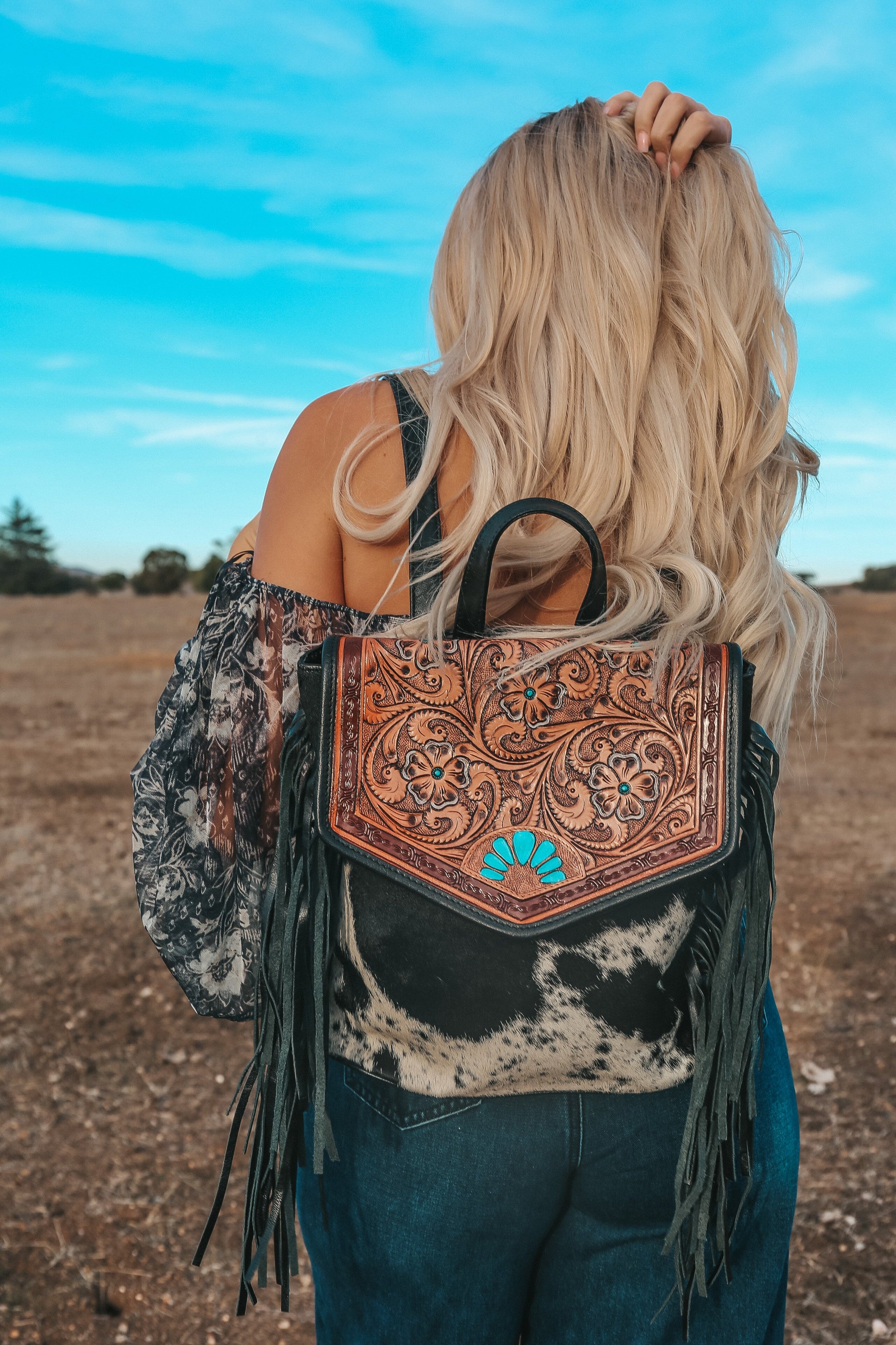 Turquoise, Fringe and Black Velvet , Ace High Bonnie is a absolute dream. She gets her name after the Wild West term “Ace High” meaning high class or respected, and she lives up to it. This backpack was designed strictly for my western women, who love the high class velvet feeling every time they reach into their bag, and also can’t live without TURQUOISE.