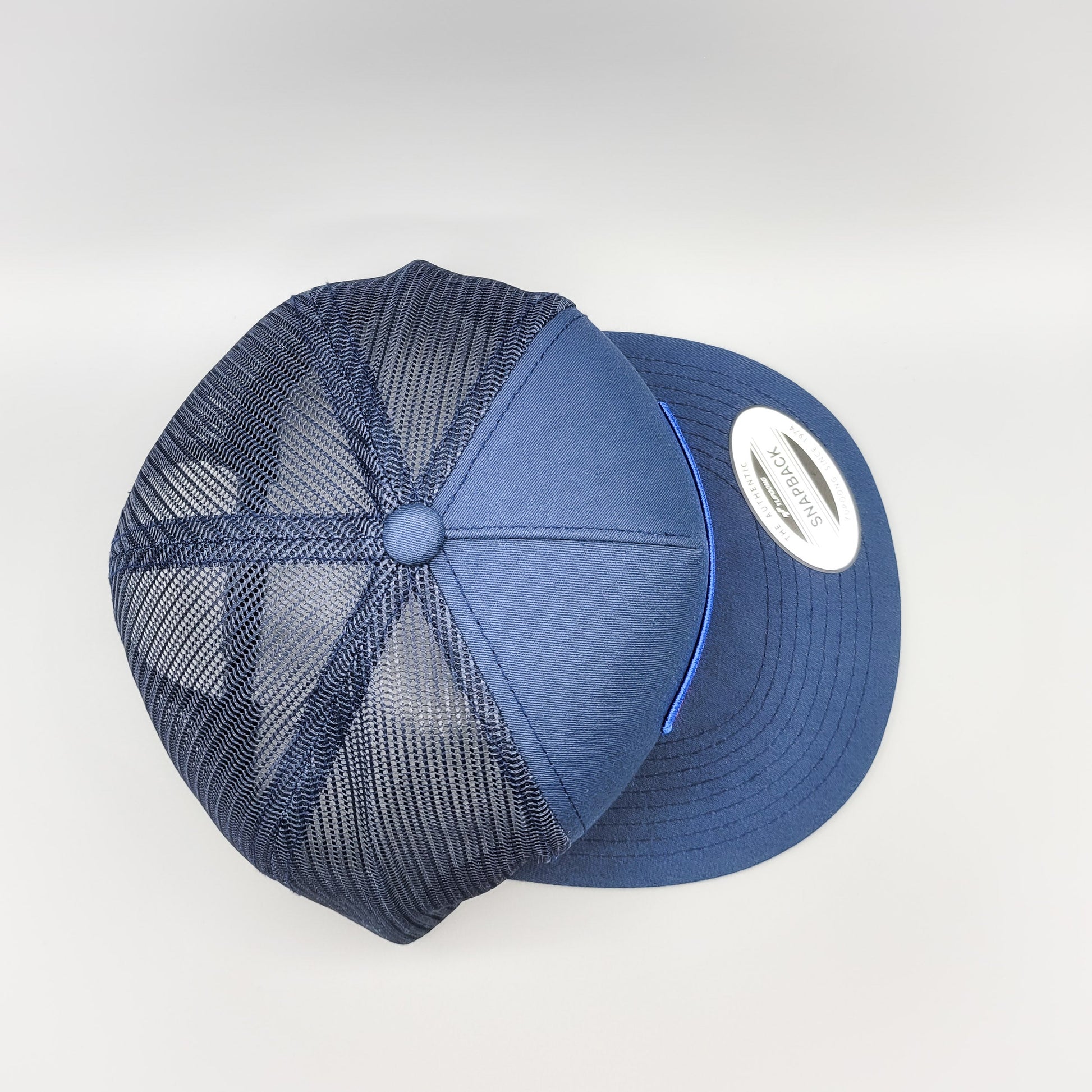This trucker hat features a navy Al Unser Valvoline Racing Team embroidered patch on a premium Yupoong 6006 Classic high-crown, mesh snapback baseball cap.