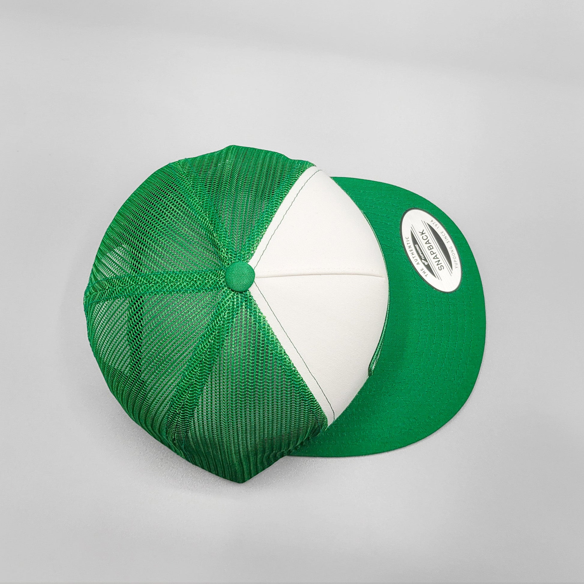 - - Classic white and green trucker cap with premium, matching mesh panels