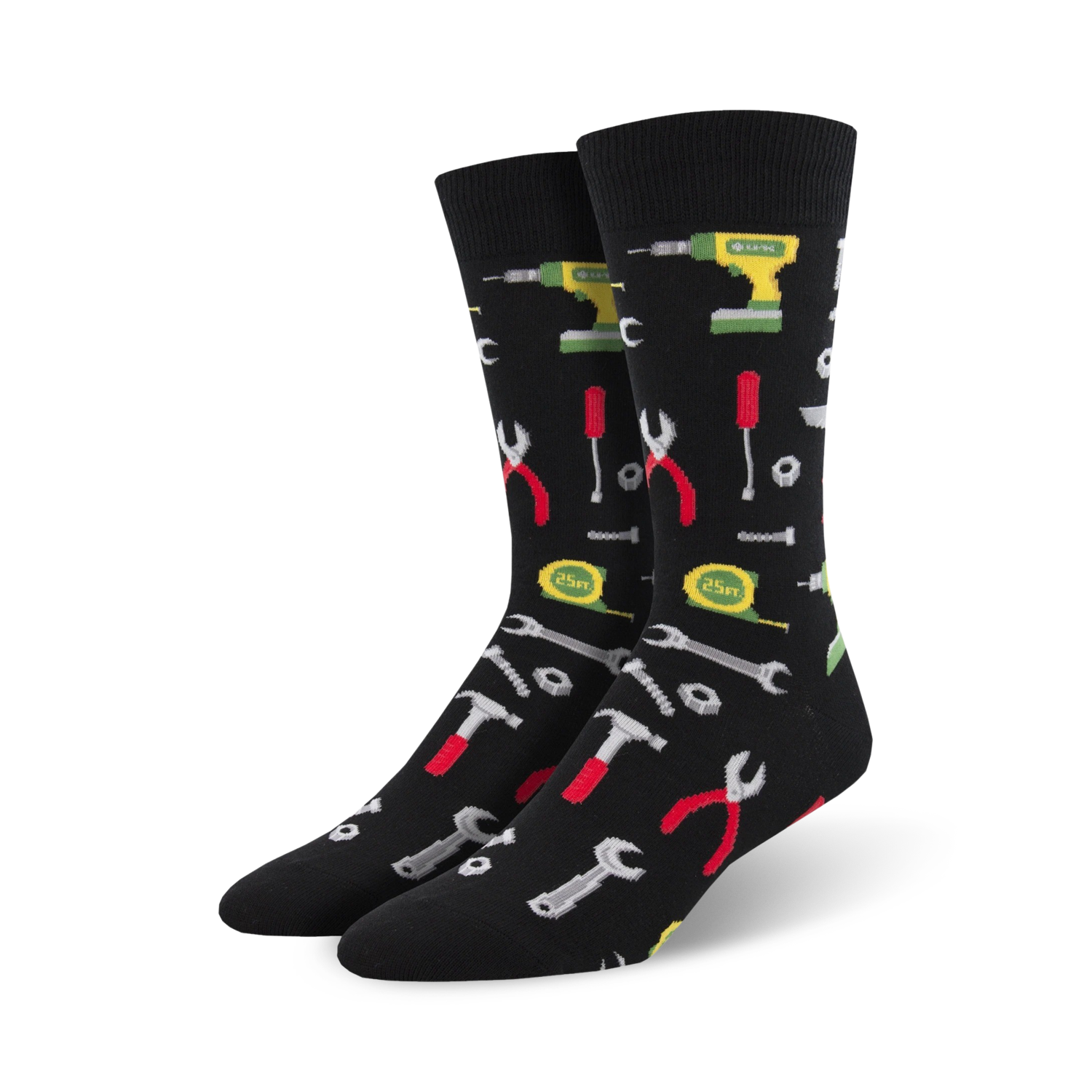 These "All Fixed" socks are tools for your feet! With a pattern of hammers, wrenches, screwdrivers, and more, these black crew socks will let everyone know that you're handy with a toolkit. These socks are quite the handy accessory, even if you have two left feet. Get ready to hammer out compliments wherever you go in these DIY-licious socks!