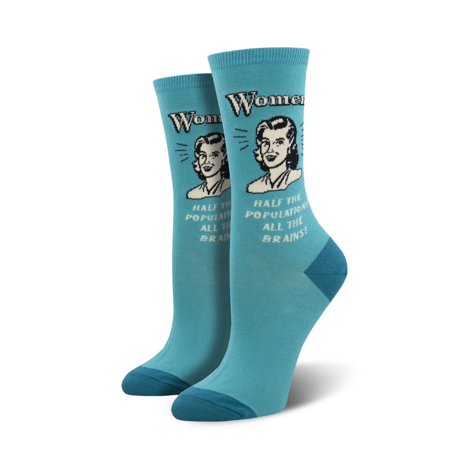 These aren't just socks, they're a statement! Show off your girl power with these electric blue crew socks that proclaim "Women...Half the population, all the brains!". Perfect for the witty feminist who's not afraid to stand up for her smarts. Let your feet do the talking and leave no doubt that women are the brains behind the operation. Grab a pair today!