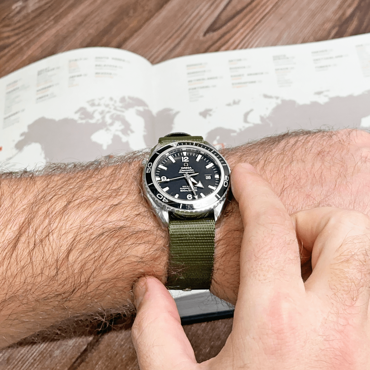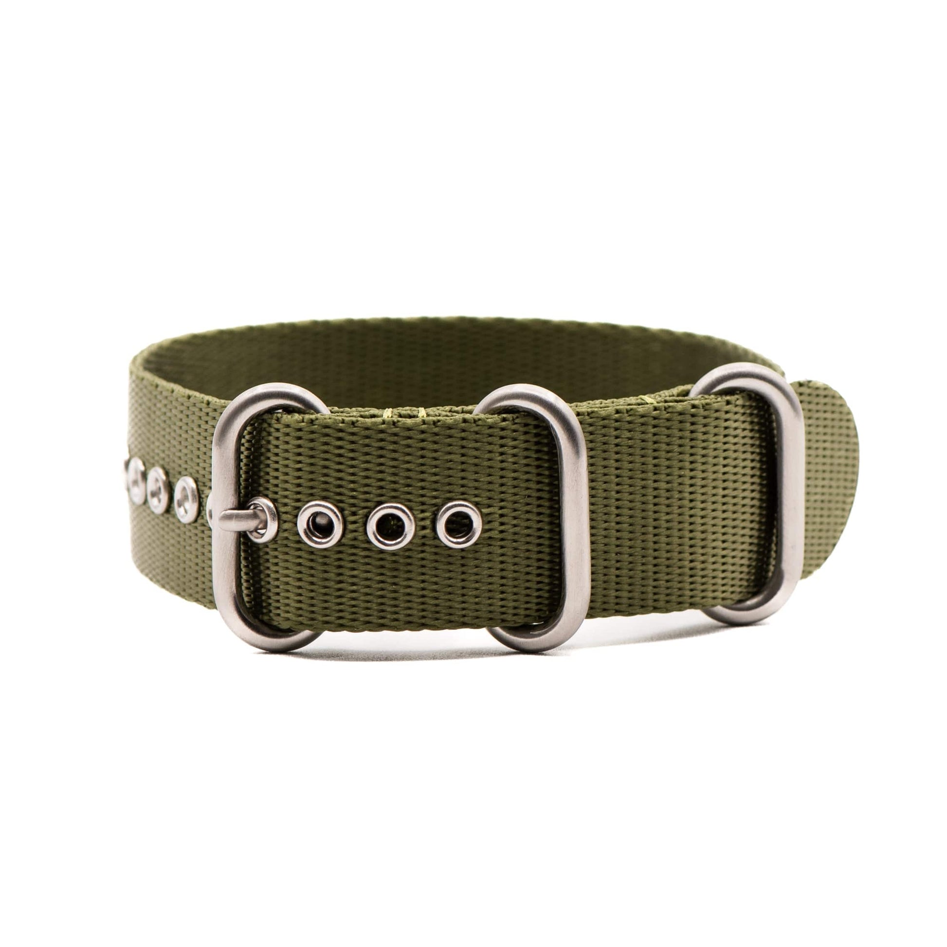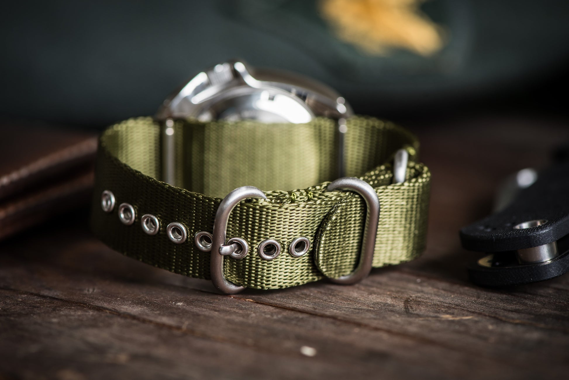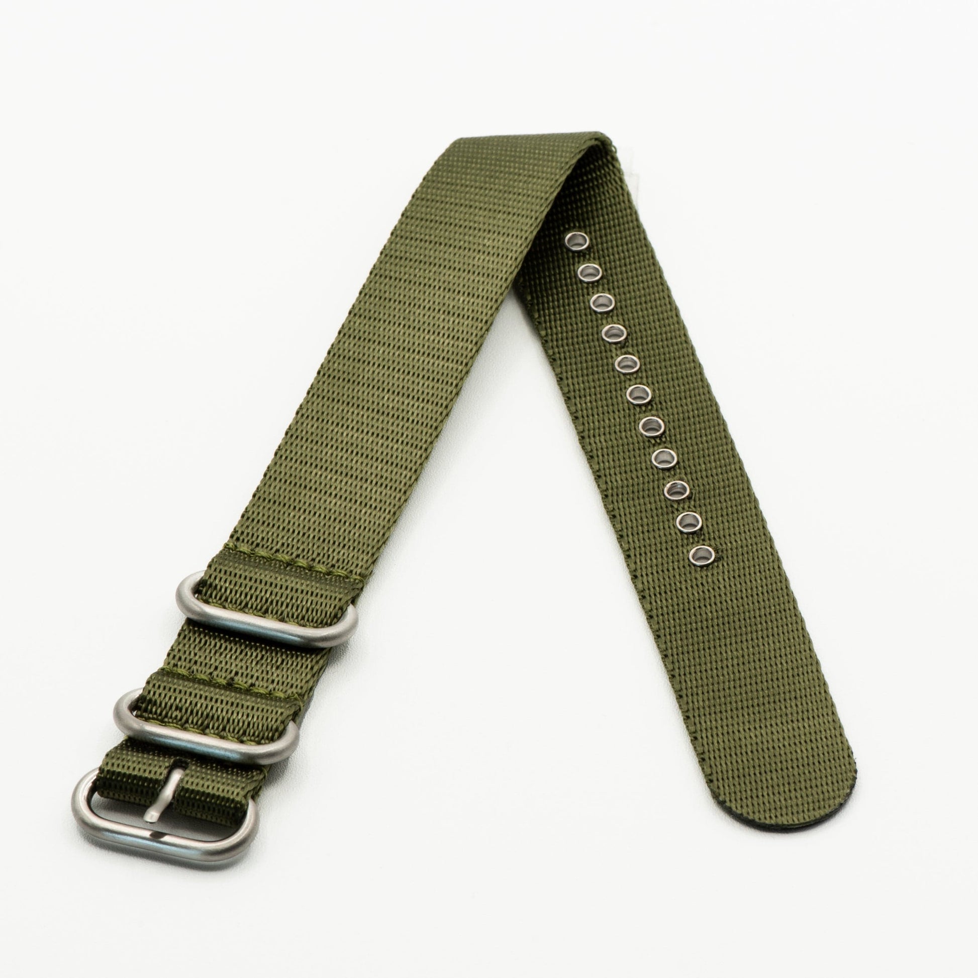 The strap itself is made from our AlphaShark nylon which features 1.4mm thick high tensile strength "seat belt" webbing. Steel ring buckle and keepers are double-stitched on the strap resulting in a never-fail construction. Strap holes are reinforced with metal grommets for a durable connection. It's our most rugged and durable strap yet - we can't wait for you to try it out and put it to the test.
