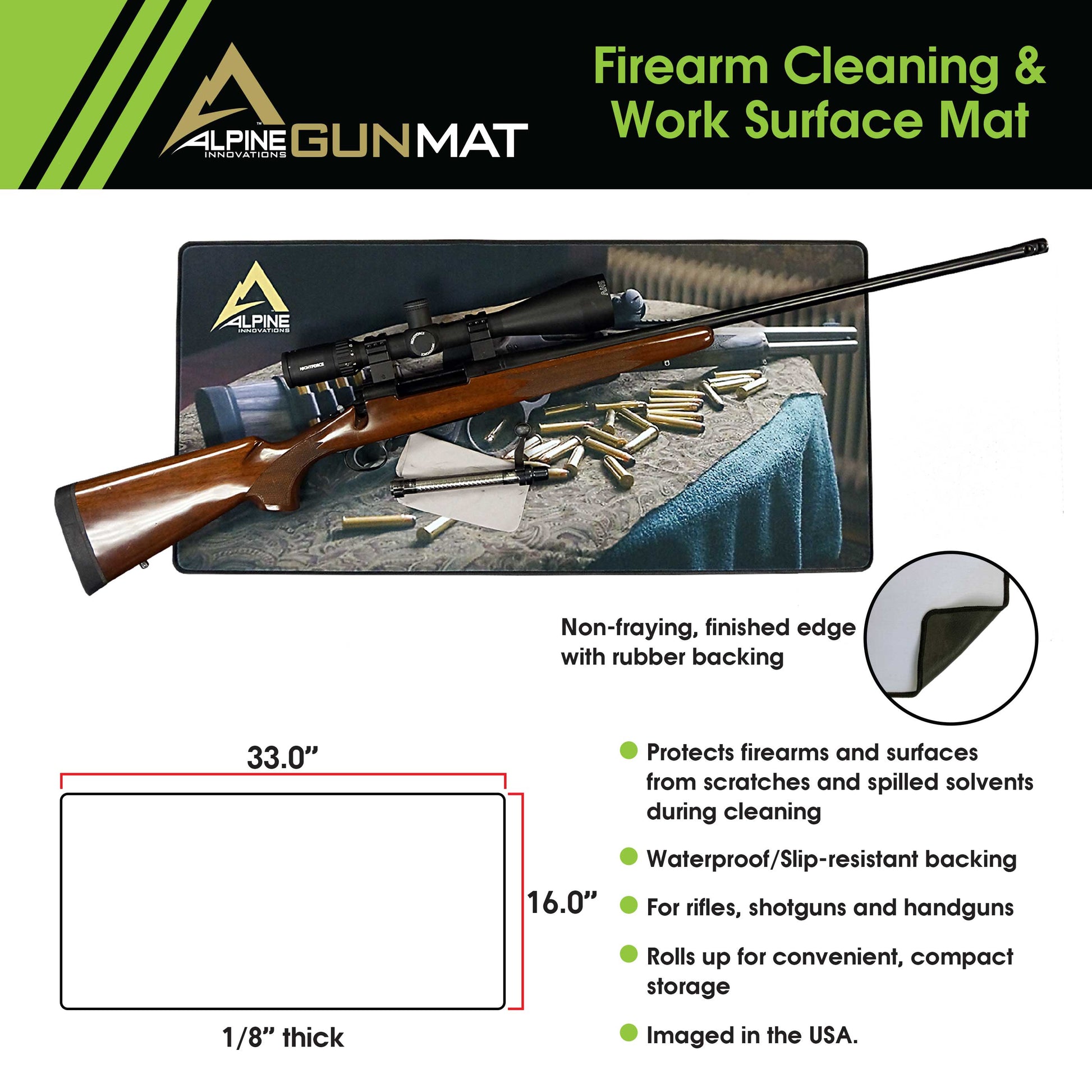The Alpine Surface Mat is made of a durable nonslip material that is versatile for all uses. This mat will help protect your gun from any scratches, dings or drop while cleaning any type of firearm. The Alpine Surface Mat is great for your work bench and can also be easily rolled up and transported to any other area you'd wish to use it. Measurements are 33" X 16" X .125. Offered in a variety of designs.