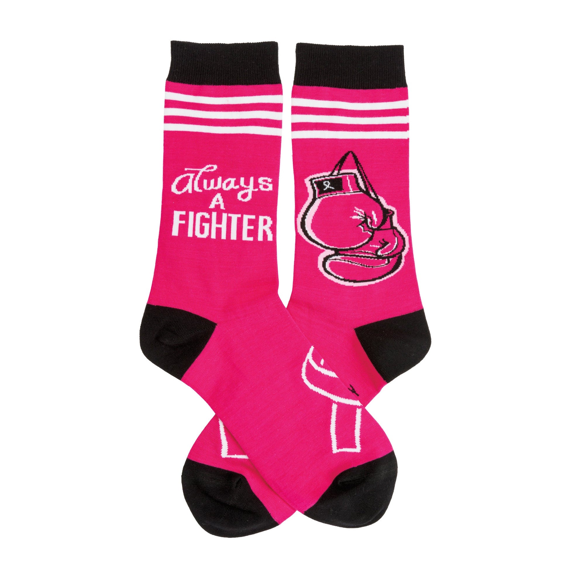 These 'Always A Fighter' socks pack a punch! They're bright pink with a bold black-and-white boxing glove graphic on one side. The visible portion also features the words 'Always A Fighter' in a stylish script. The cuffs are black with thin white stripes. They're crew socks with a black toe and heel. Perfect for adding a little sass and spirit to any outfit.