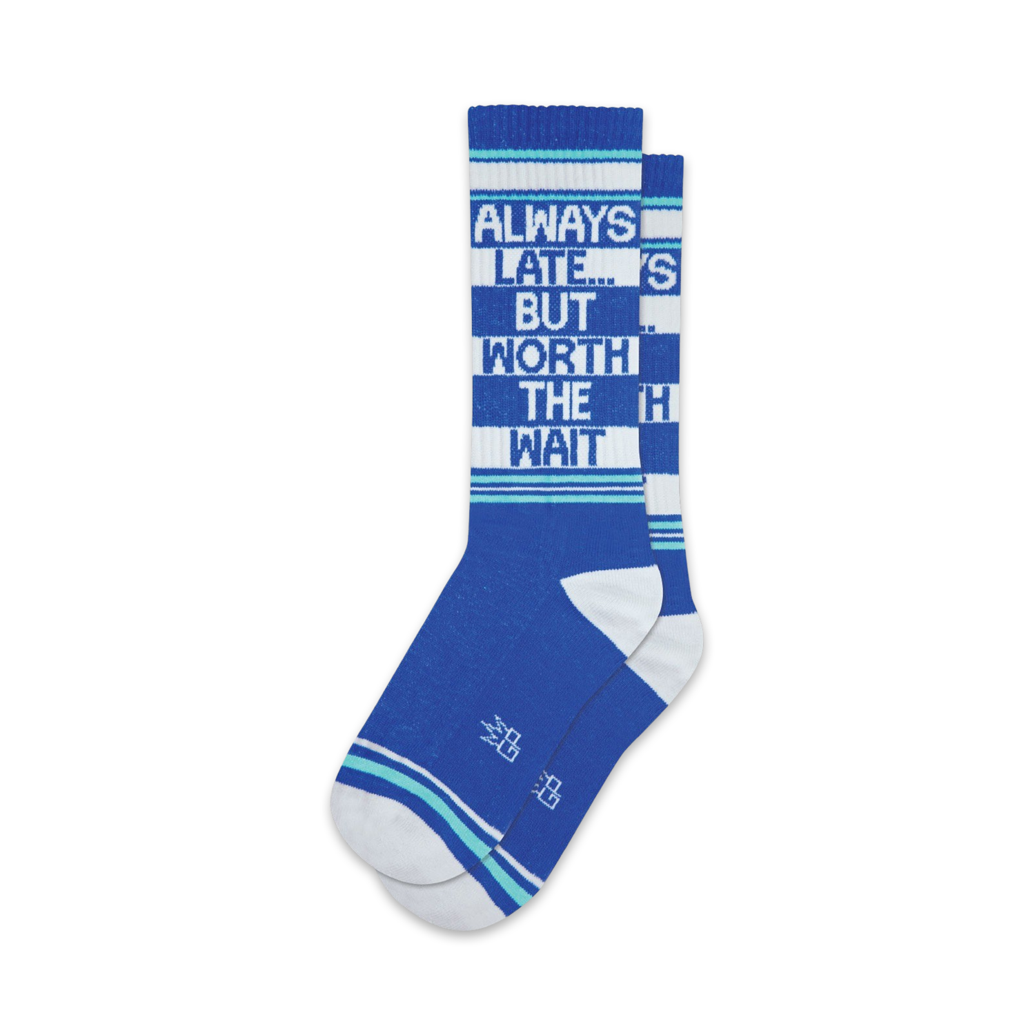Who says gym socks can't be fun and funky? These Always Late... But Worth The Wait Gym Socks are the epitome of quirky. Featuring striking blue and white stripes and bold white text that says "Always Late...But Worth the Wait," these socks are bound to elicit chuckles and curious glances at the gym. Like a fine wine, you may be fashionably late, but it will be worth the wait when you arrive rocking these babies. Crafted for both men and women, these crew-length socks will keep your feet comfy and stylish. So, if punctuality isn't your forte but you're fabulous regardless, add some humor to your workout wardrobe with these witty socks.