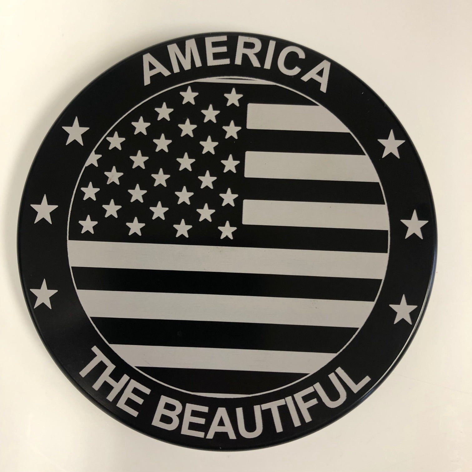 Laser engraved black anodized aluminum. Our trailer hitch covers are made from ⅜” thick 6061 aircraft grade aluminum with a military grade anodizing. The receiver is powder coated steel and come with a zinc plated pin and clip.