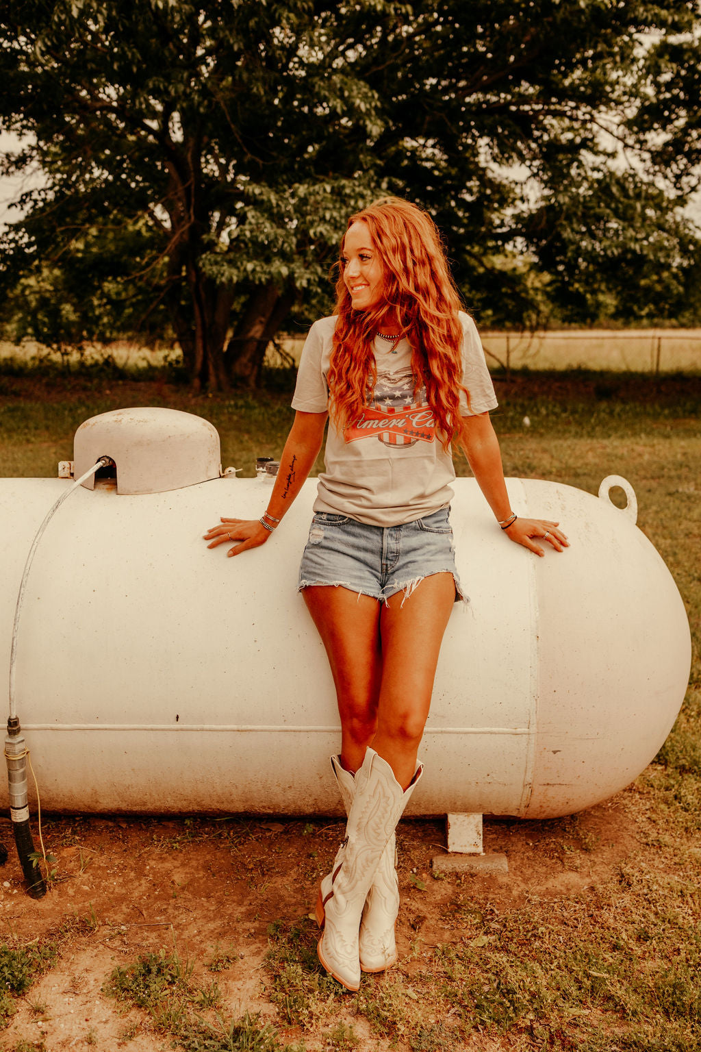 Show off your love for all things USA with our American-made AmeriCAN Beer Graphic Tee! This cropped white graphic tee has a stars and stripes covered beer can graphic. Pair with our High Rise Medium Wash Distressed Denim Shorts for a casual all American look!