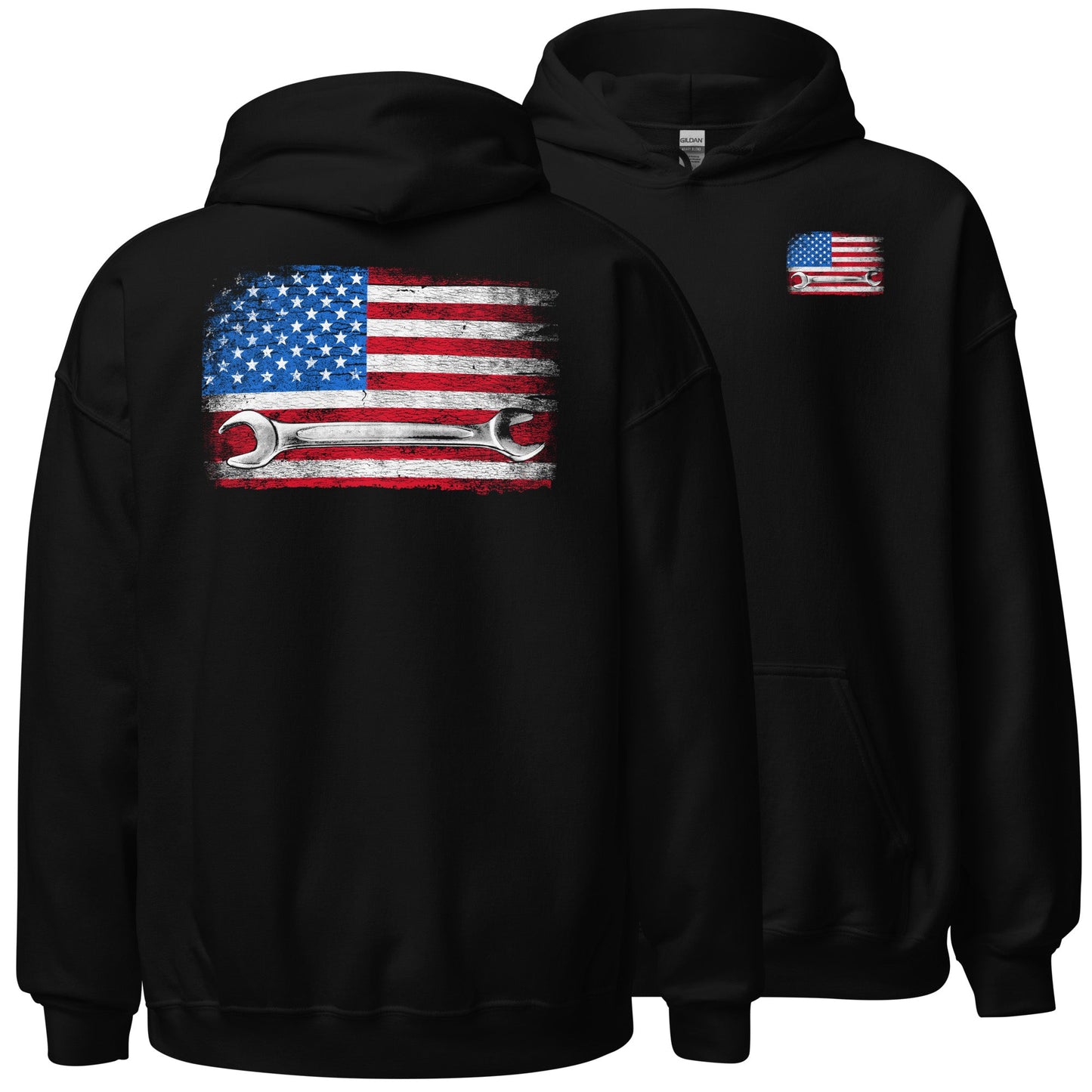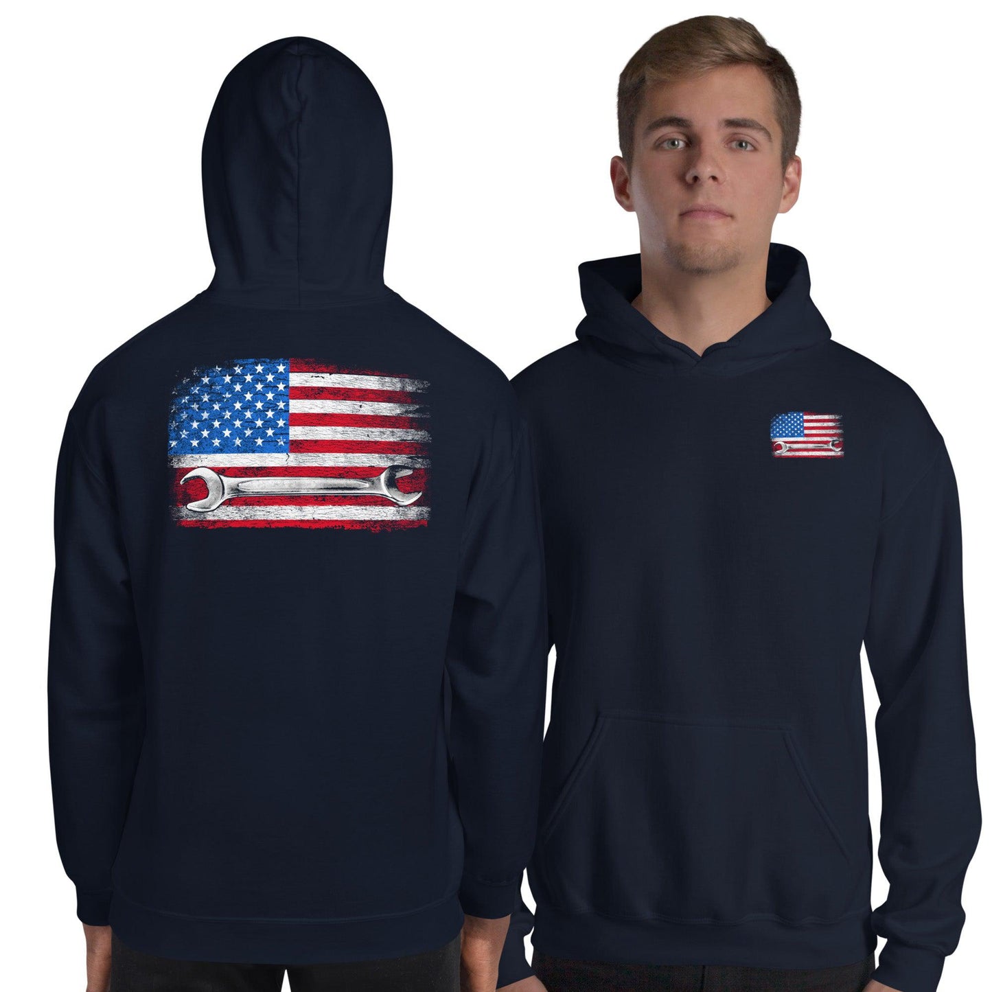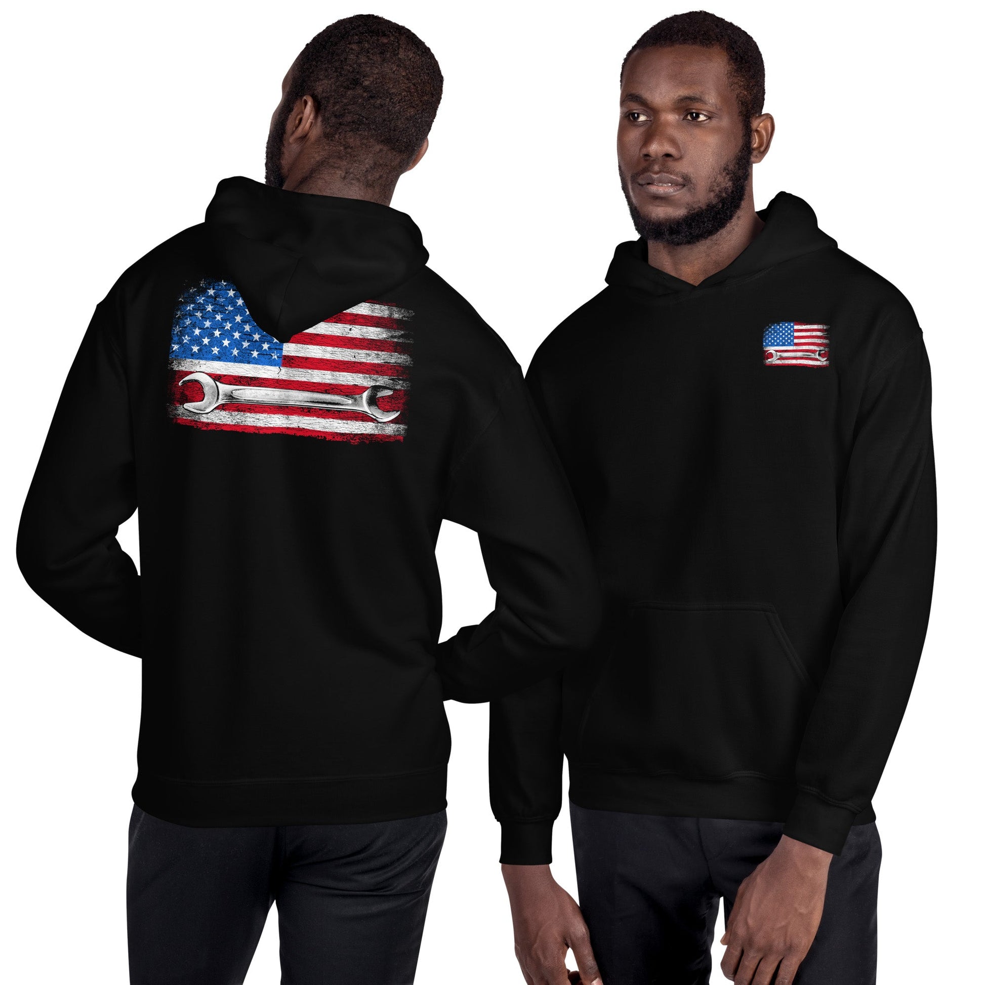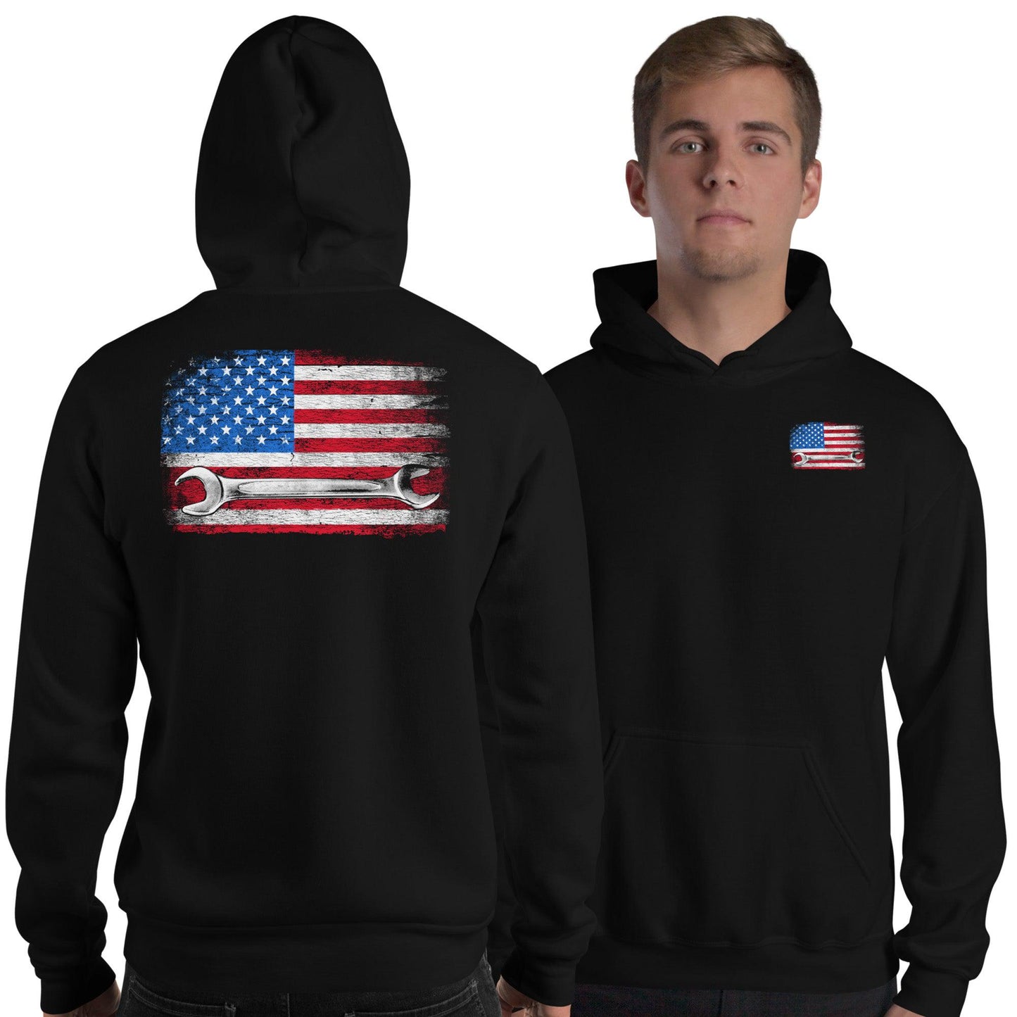 This American Flag Mechanic Hoodie Sweatshirt was made with patriots in mind. Show off your love for the United States with a unique design specifically tailored for mechanics. Make a statement and look your best wearing this distinctive hoodie!