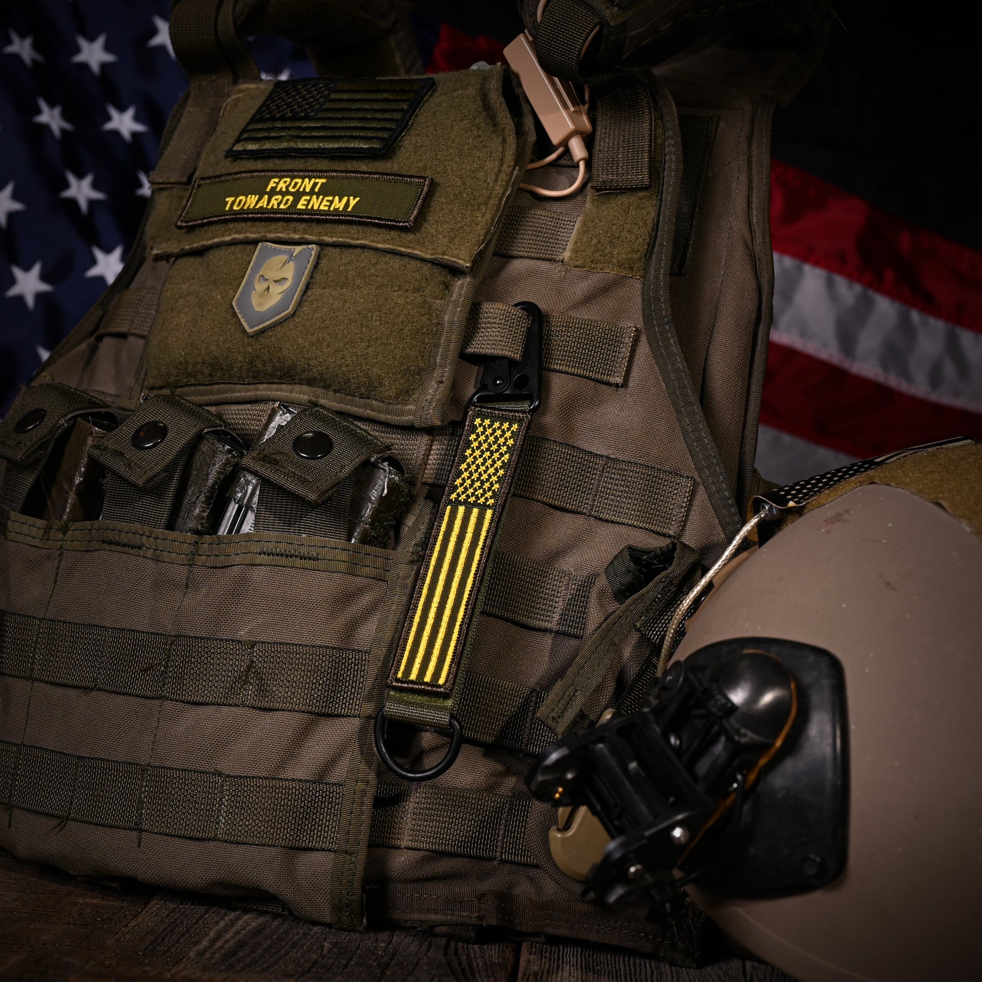 Designed to resemble a jet tag but with tactical functionality and ease of use, our tactical keychains are composed of heavy duty MIL-SPEC nylon webbing, a 2" spring-loaded HK clip, embroidered and removable 1x5" Velcro tapes on both front and back, and a 1" sturdy steel D-ring. Attaches easily and securely to belt rings and tactical gear. Exclusive to Freedom Fatigues, our tactical keychains are handmade in America by a fellow veteran-owned company with materials sourced entirely in the USA. Sold individually.
