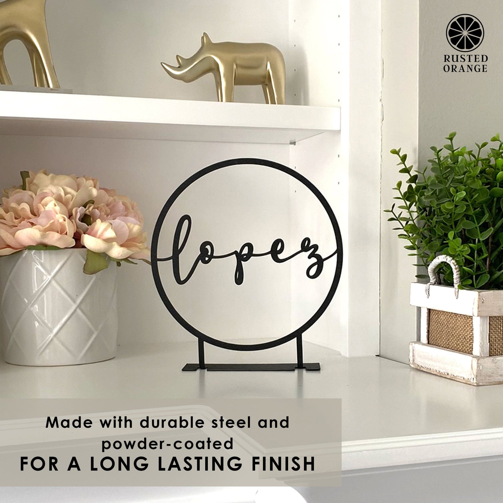 Name Style: Features a single name in a modern all-lowercase script that stretches seamlessly across the center of the circle frame. The connected lettering creates a sleek, minimalist look that suits any space.