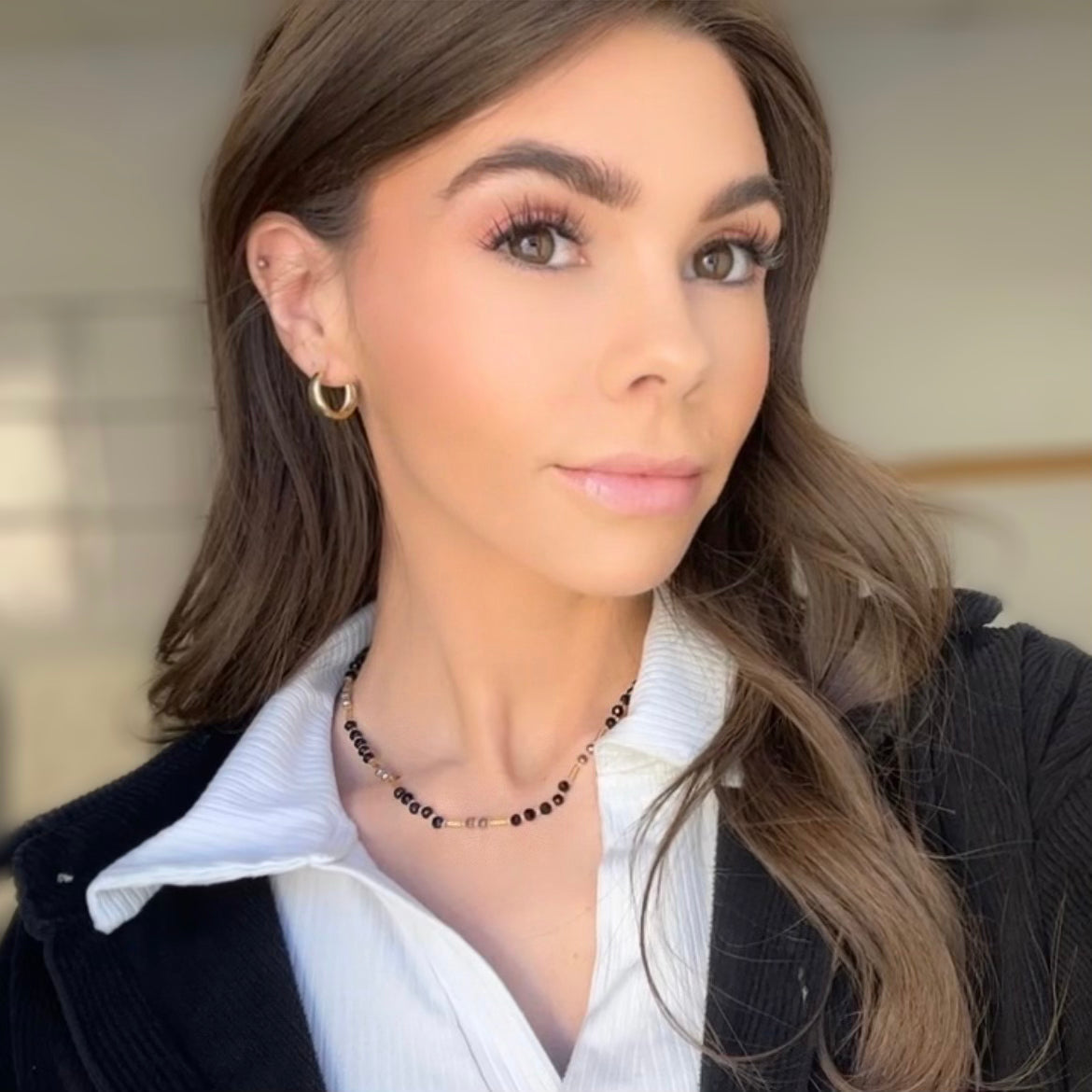 Our beautiful Ansley choker necklace has primary colors of Black & Gold. This necklace measures 16 inches.