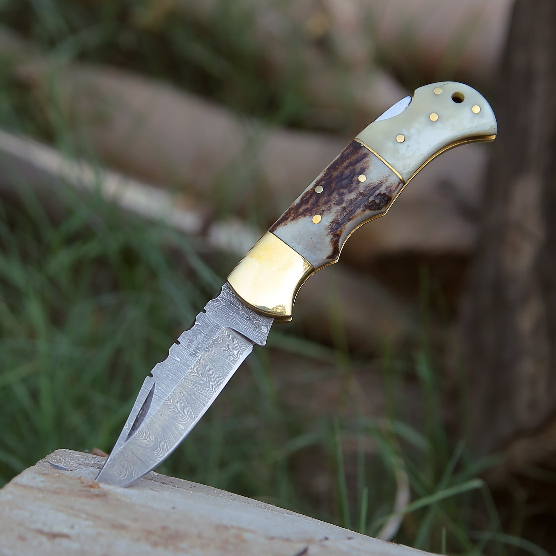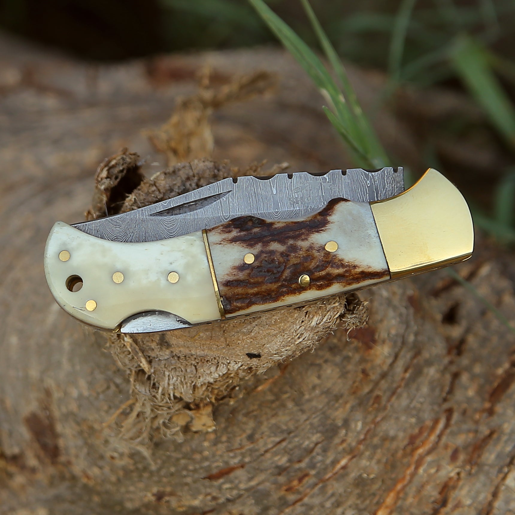 Antler Edge Handmade Custom Damascus Folding Pocket Knife - 7.5" Overall with Stag Horn & Bone Composite Scales, Back lock Pocket knife with Hand Stitched Leather Sheath, Pro Knife Sharpening, Spare Pocket knife Sharpener & Personalized