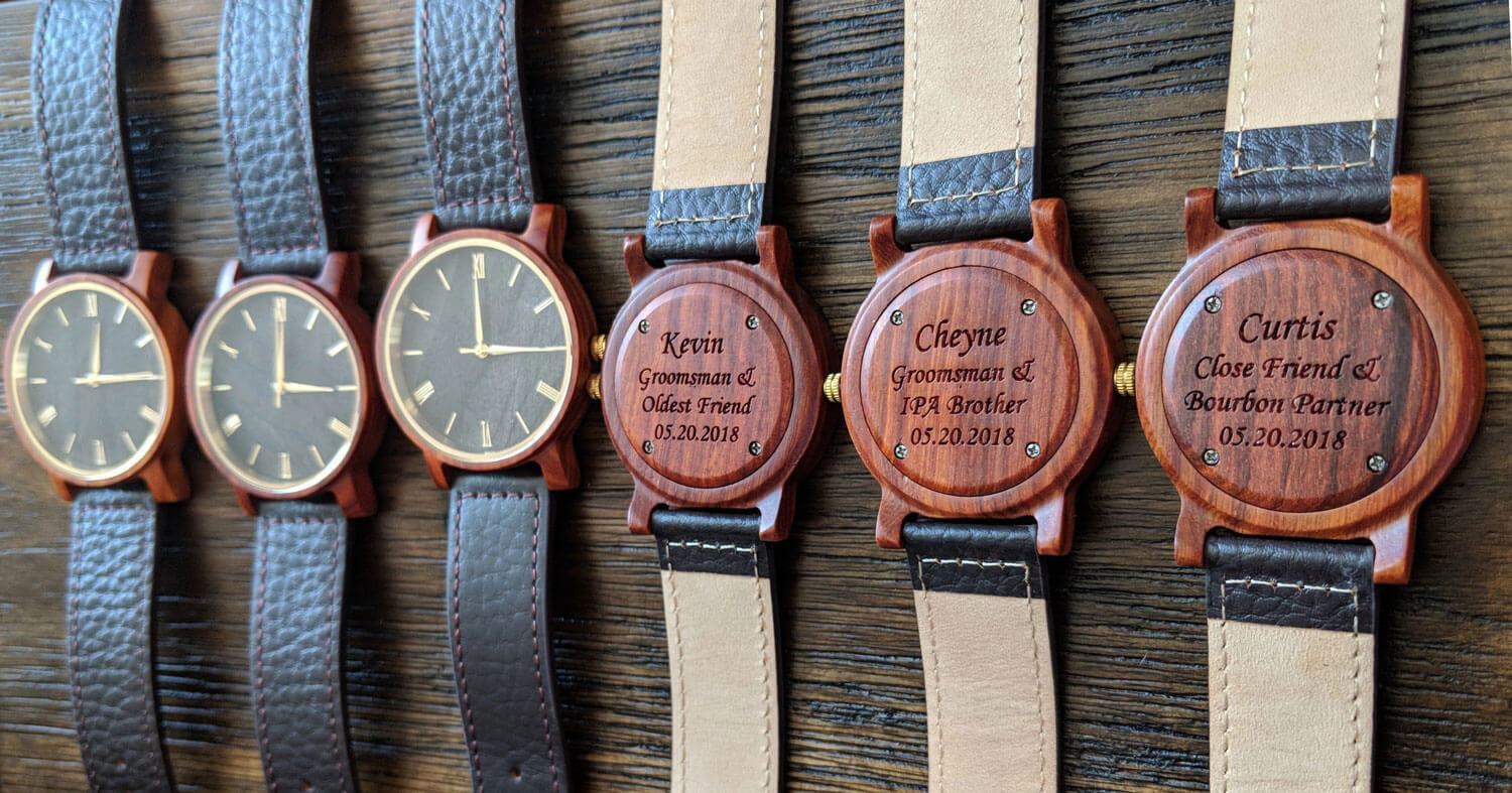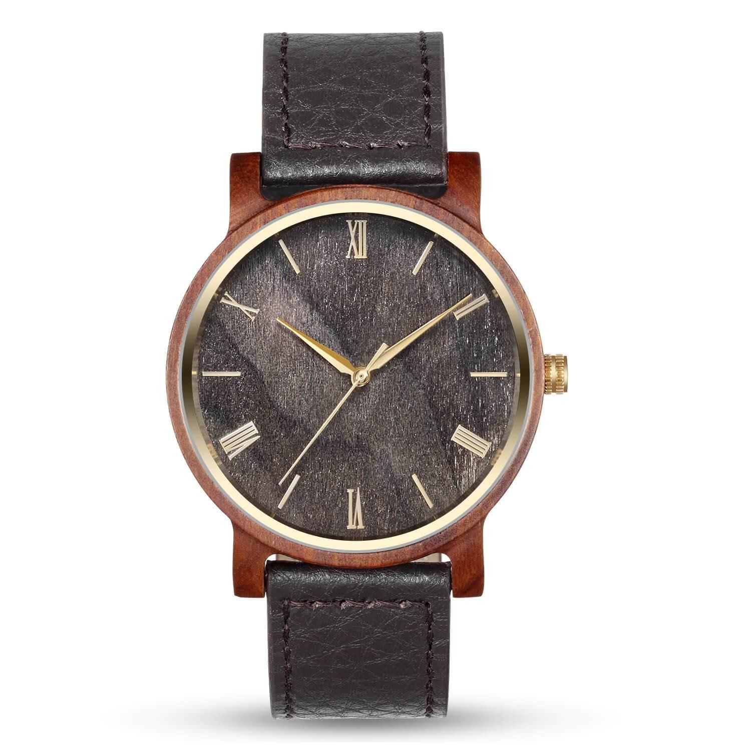 A wooden watch, that offers a beautiful wooden frame, that is paired with a leather strap. This wooden watch dial showcases a textured red wooden base, that is brought to life using golden Roman numerals and hands. Add your personal touch, by getting your wooden watch laser engraved with your personalized message.
