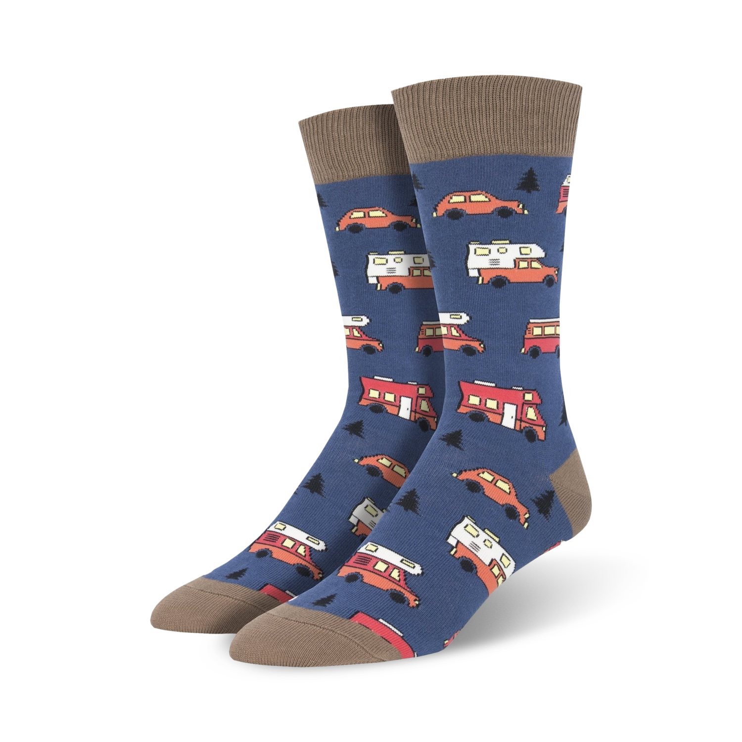 Get ready to hit the open road with your feet in our "Are We There Yet?" socks! These vibrant crew socks boast a convoy of red, orange, and white camper vans cruising along a blue background, while scattered brown pine trees add a touch of wilderness charm. Kick back, relax, and let the journey unfold, one sock at a time! Perfect for the adventurous and fun-loving, these socks will bring a smile to your face and put a spring in your step - no matter the destination!