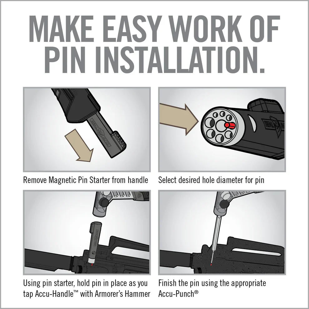Tested and influenced by gunsmiths, the Armorer’s Master Hammer is a 20-ounce, 9-1/2" long, forged hammer with full-length tang for a perfect balance and ideal ergonomics for precise control. A removable soft blow hammer head cover and interchangeable hammer heads with integrated storage makes it easy to install the correct hammer head for the application. Stored in the handle is a removable, stainless steel, magnetic pin starter to provide a helping hand when building or modifying firearms.