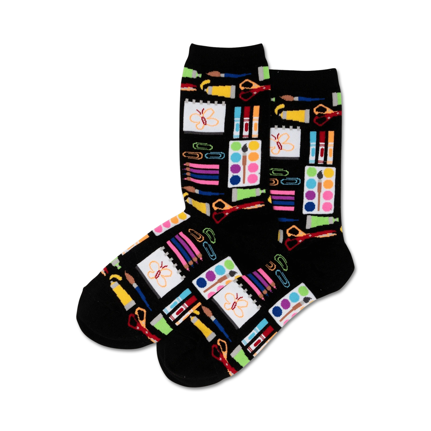 Art Supplies Socks: A Creative Twist to Your Feet These Art Supplies Crew Socks are a vibrant masterpiece for your feet! Featuring a playful pattern of colorful pencils, scissors, glue sticks, notebooks, and paint sets, these socks are sure to add a pop of creativity to your everyday style. Let your feet do the talking and show off your inner artist wherever you go!