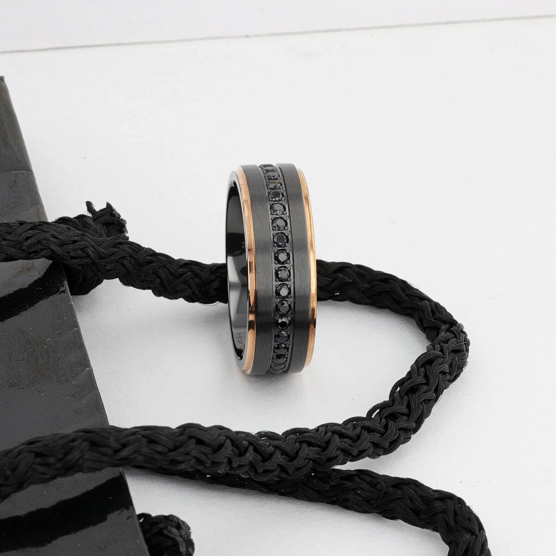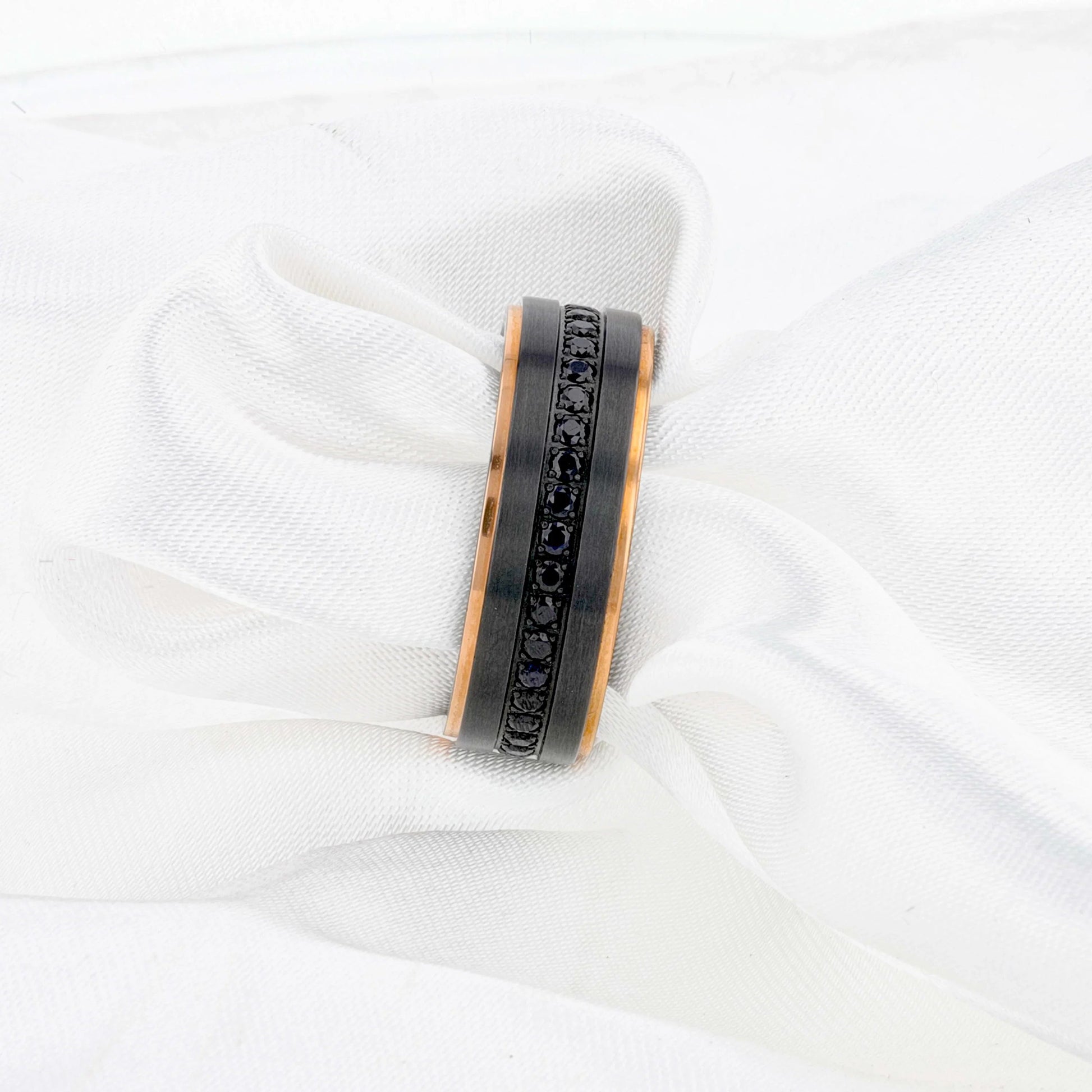 ASTRO Flat Brushed Black Titanium Ring with Rose Gold Plated Edge and Black Sapphire Settings All Around - 8mm