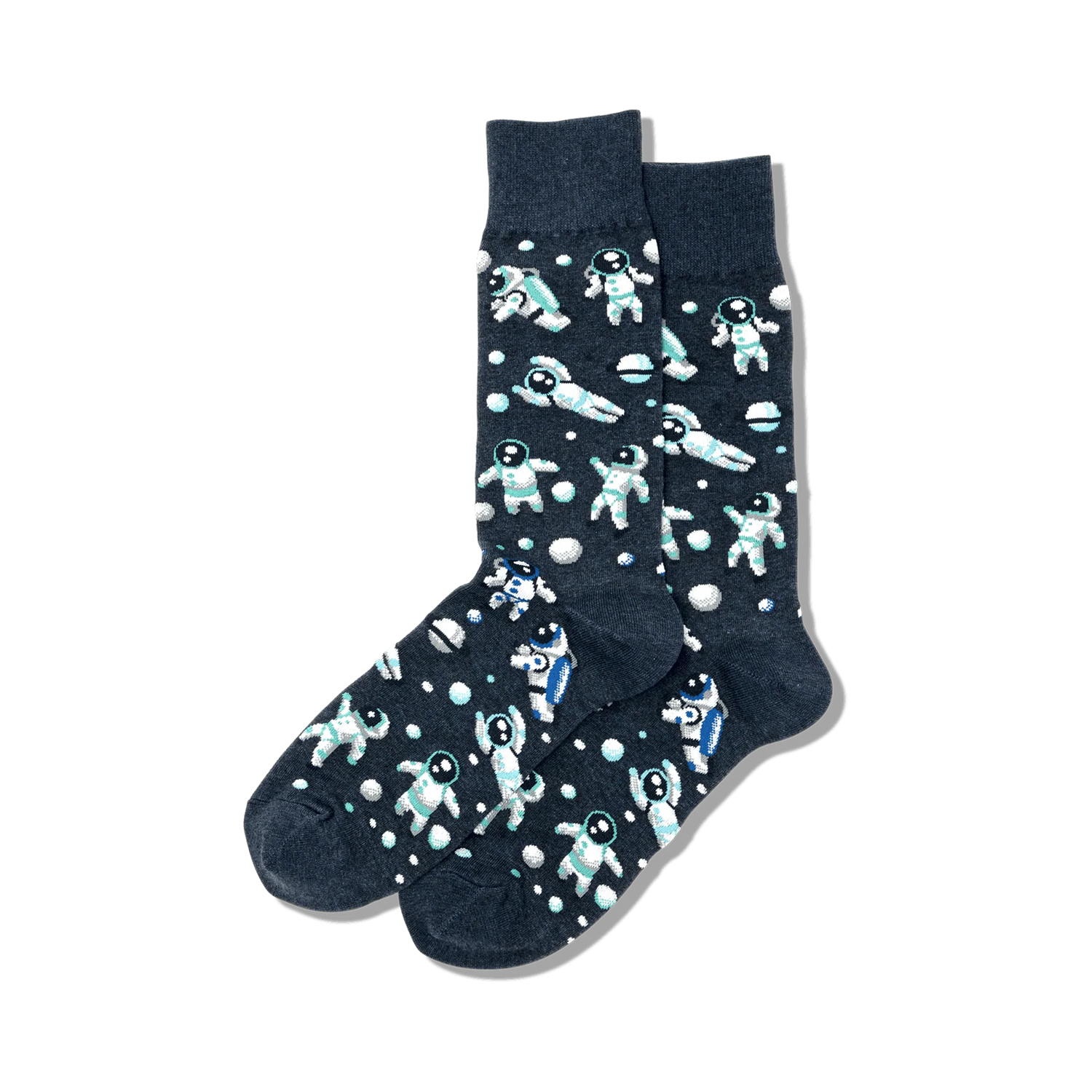 Blast off into your own orbit with these dark blue, space-themed crew socks. Featuring a cheerful pattern of cartoon astronauts in white and blue, these socks will make you feel like you're flying high among the stars. These socks are so fun, even Neil Armstrong would approve!