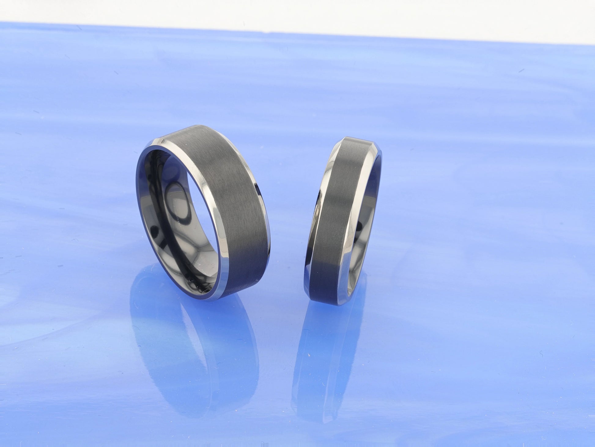 ATNOS Men’s Black Titanium Wedding Ring with Brushed Center and Polished Beveled Edges — 6mm & 8mm