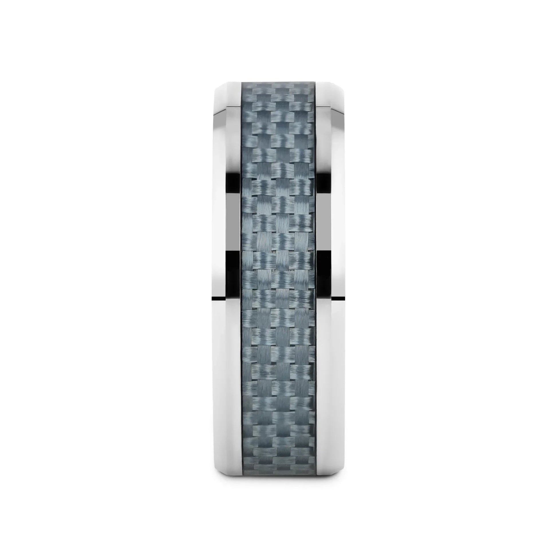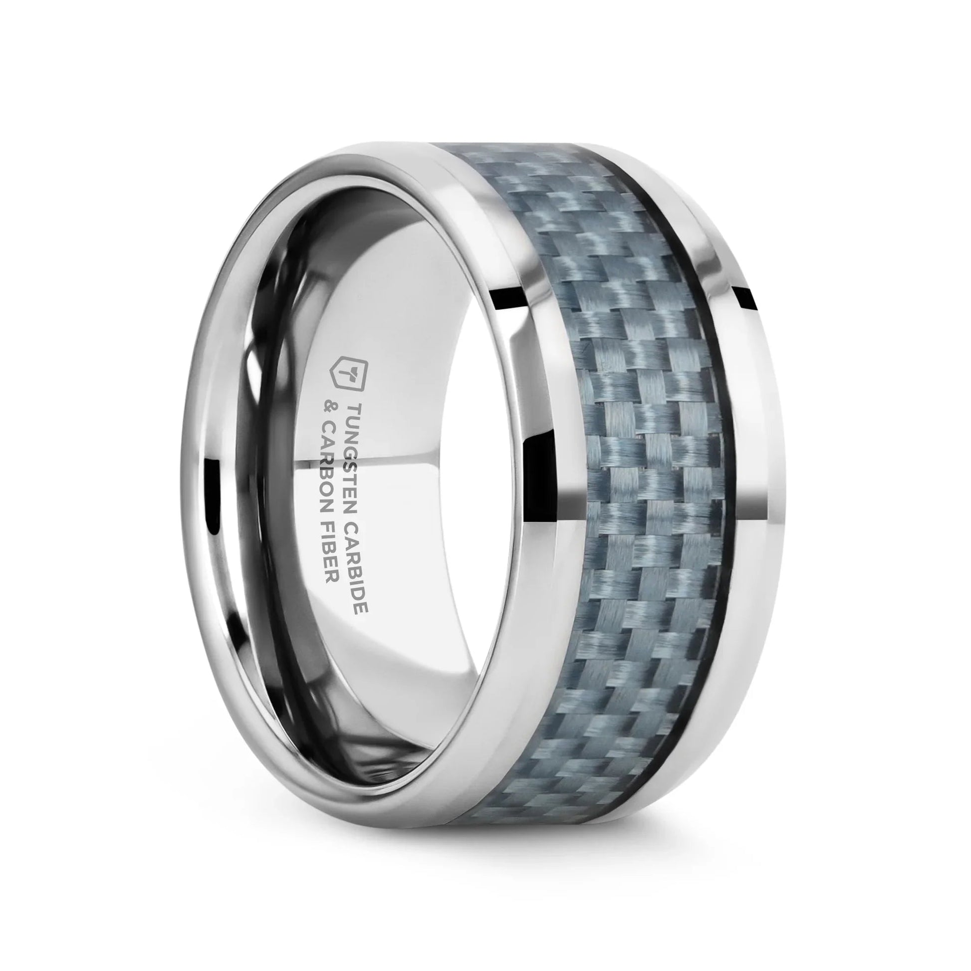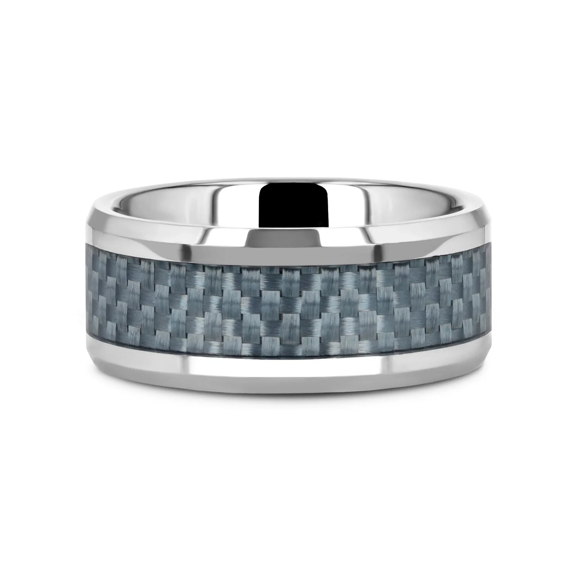This bold and durable flat-profile Tungsten Carbide wedding band design by Thorsten features polished beveled edges and a premium light blue Carbon Fiber inlay.