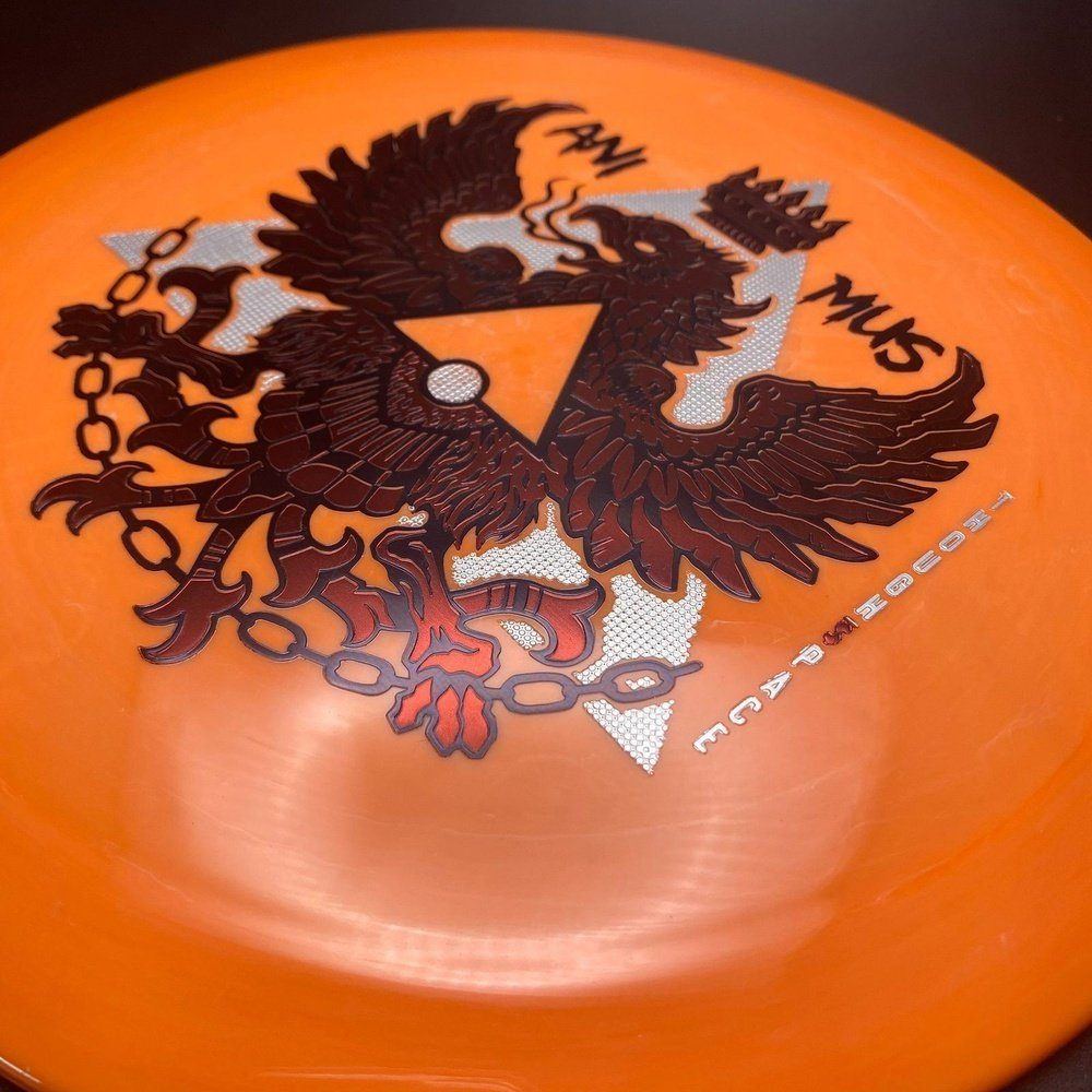The Aura Animus Crest from Thought Space Athletics is a stable to overstable distance driver that's perfect for your longer range shots. This is the second run and slightly more stable than the first run. The magnificent stamp on these swirly discs features a bird of prey with a crown above it. The forked tongue and chains locking the feet from flying give the Animus Crest a unique stamp. There is also a triangle inside of the bird and surrounding it.