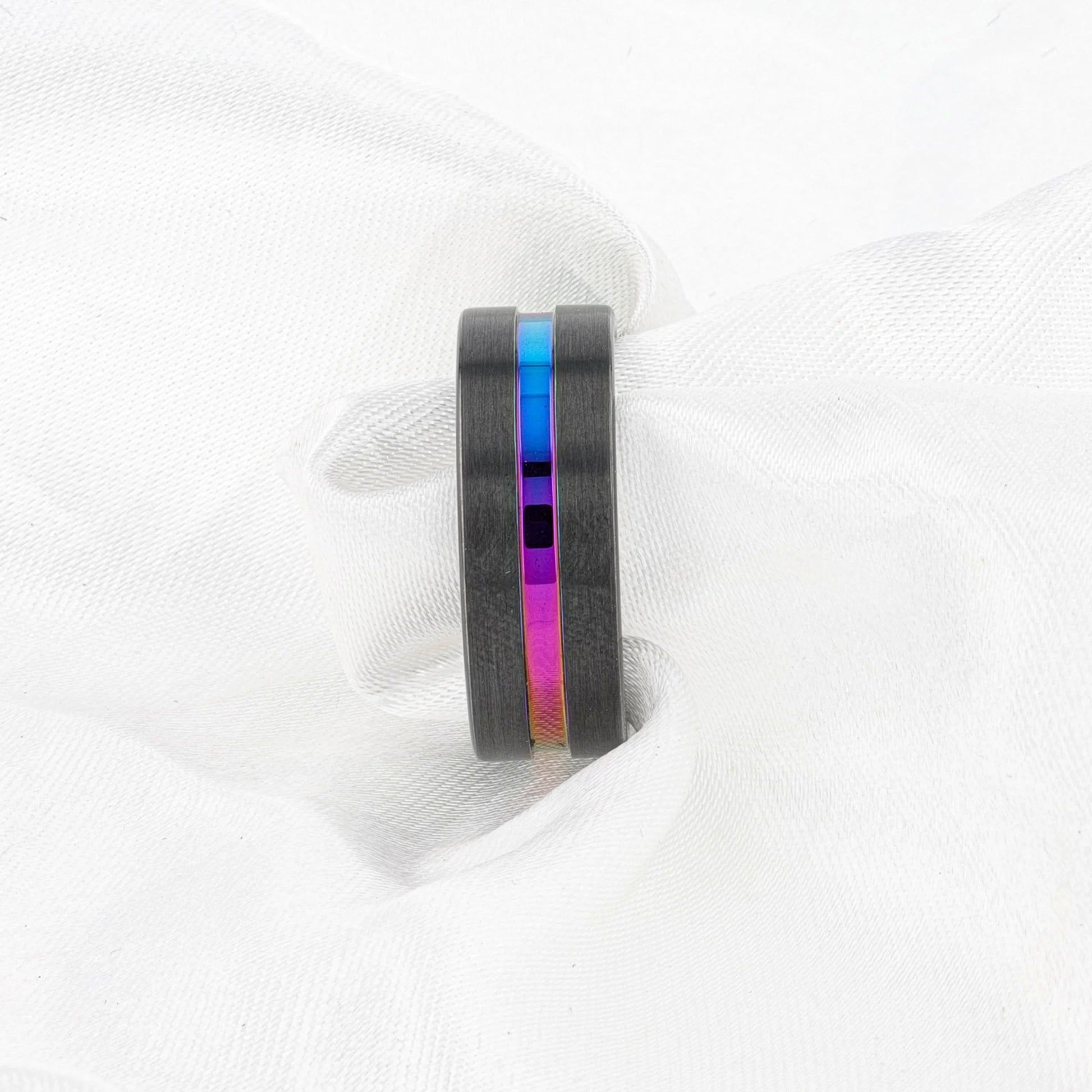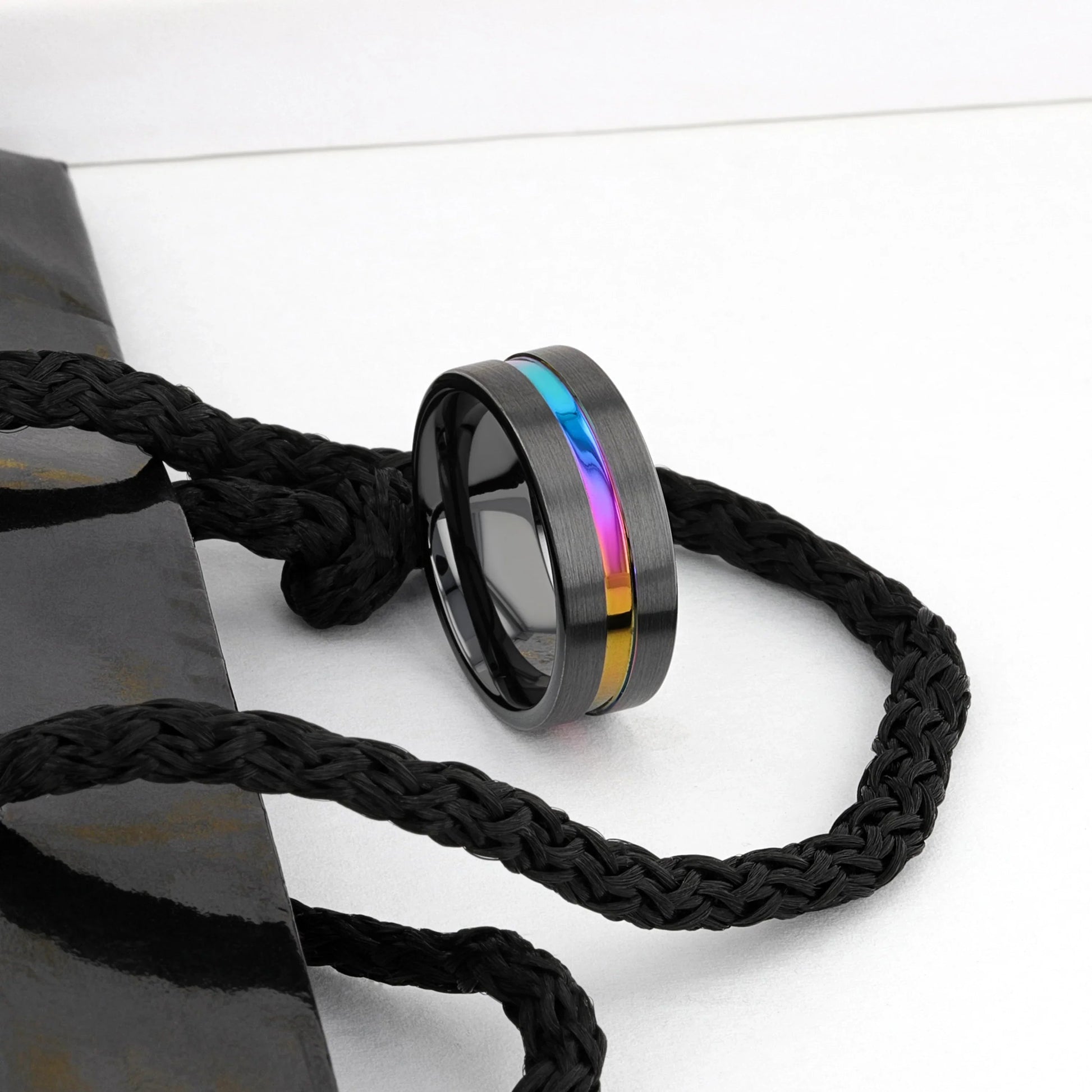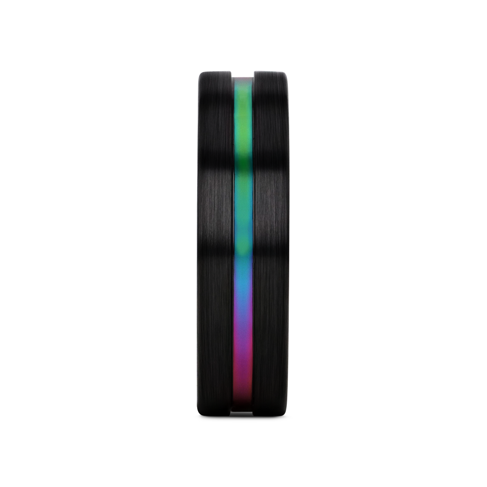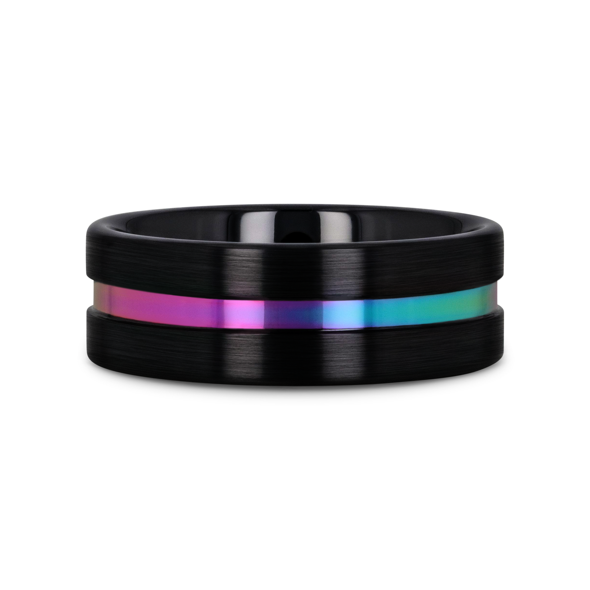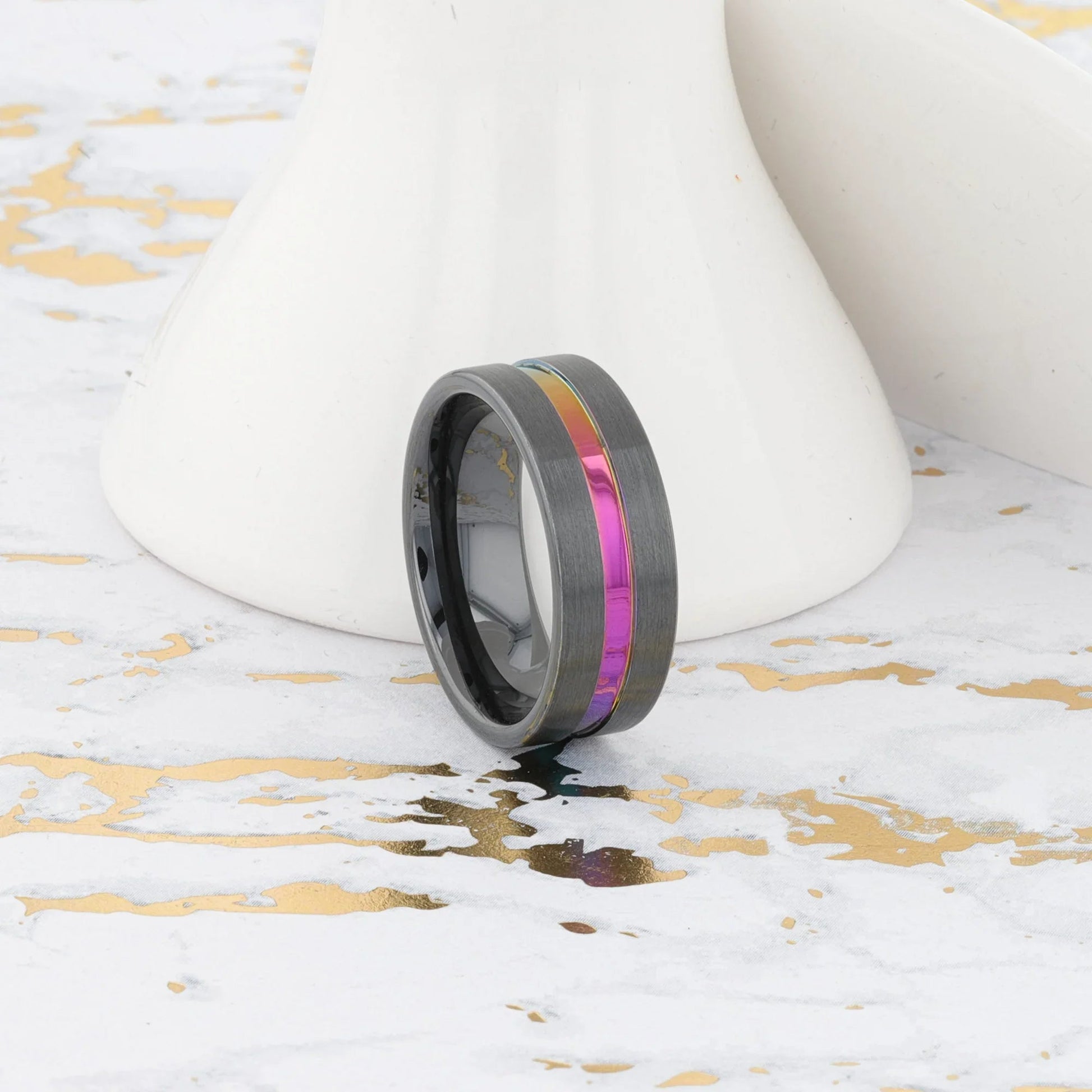 This highly sought-after style from our Black Ceramic ring by Thorsten is simply beautiful and features a brushed finish with an inset colorful grooved rainbow. Can be worn as a wedding band or promise ring.