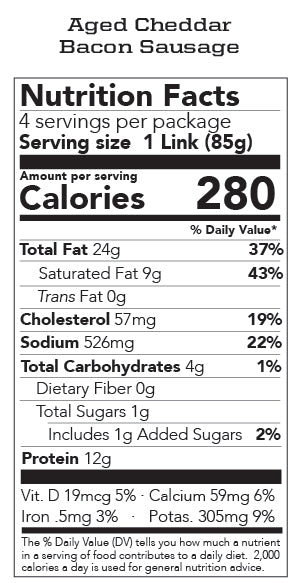 - Aged Cheddar - Loaded with Wisconsin made all-natural cheddar cheese, the perfect pairing with bacon. Winner of Esquire Magazine’s Best Food in America. This sausage is best on a bun with the topping of your choice.