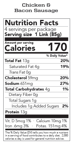 - Chicken & Bacon - Our lowest fat & calorie sausage. Nearly half the fat and calories compared to our Hickory & Applewood, we still add nitrate-free bacon we just substitute all the pork with Gap 2 certified chicken white meat tenderloins. A great all around cooking or on-a-bun sausage, perfect for adding flavor to any dish with vegetables, pasta or gain dishes, soups, and stews.