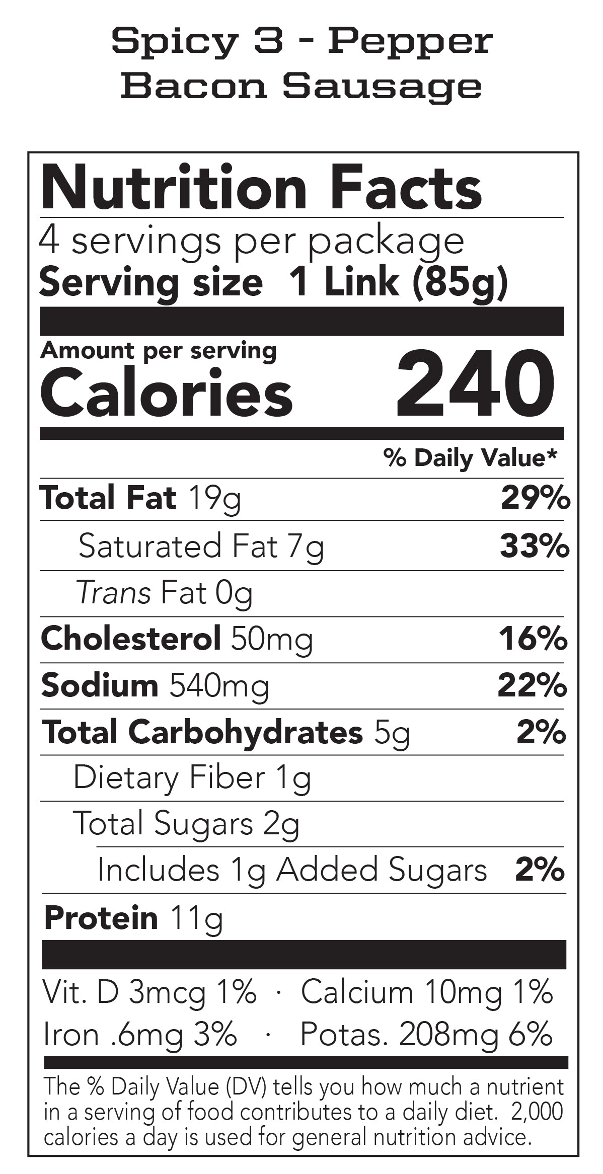 - Spicy 3 - Pepper - This is our spicy bacon sausage. Made with fresh jalapenos, dried habaneros, and crushed red chilies, this bacon sausage is for the spicy lover. Four-time winner at the Culinary Fight Club. A great cooking sausage paired with something sweet (like apples or mangos) or something sour (e.g. hot and sour stir fry), it’s also great to add heat, smoke, and bacon notes to jambalaya, chili, and soups.