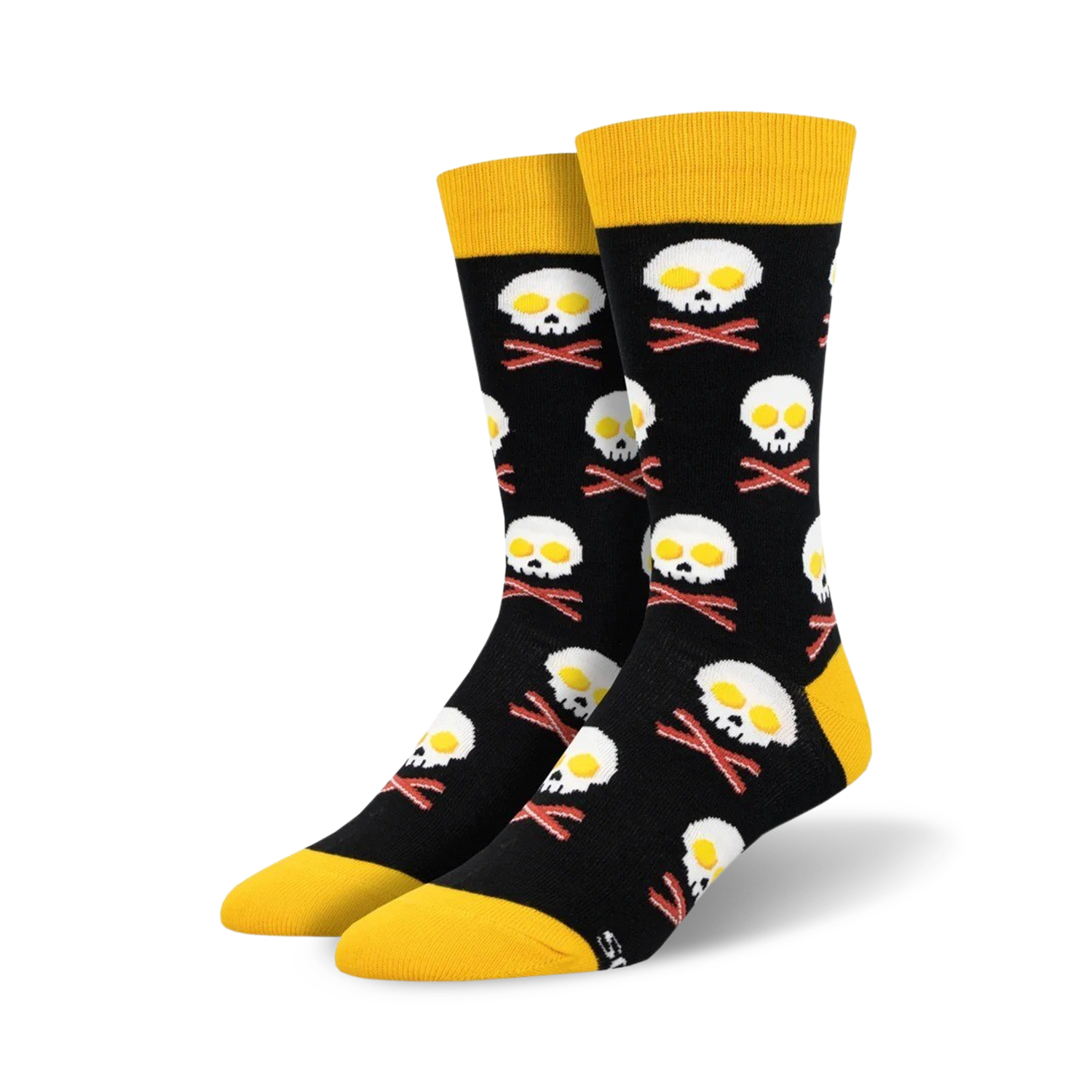 Wake up and smell the... socks? Yes, that?ÇÖs right! Our ?Ç£Breakfast of Champions?Ç¥ crew socks are here to add a dash of rebellious flair to your morning routine. Cloaked in a sleek black, these socks feature a daring pattern of eggs and bacon?Çönot your ordinary breakfast, though. These aren?ÇÖt just any eggs; they?ÇÖre eggs with attitude, shaped like skulls. And the bacon? It?ÇÖs crossed like crossbones, warning anyone who dares to challenge your impeccable taste in foot fashion. With sunny yellow accents on the toes, heels, and tops, these socks are far from your average foot coverings. They?ÇÖre a feast for your feet, a true declaration of your bold style and a cheeky nod to starting your day on the right?Çöor left?Çöfoot. Perfect for those who like their fashion served with a side of edge. So, why settle for plain when you can strut in style with a pair that?ÇÖs as unique as your breakfast preference?
