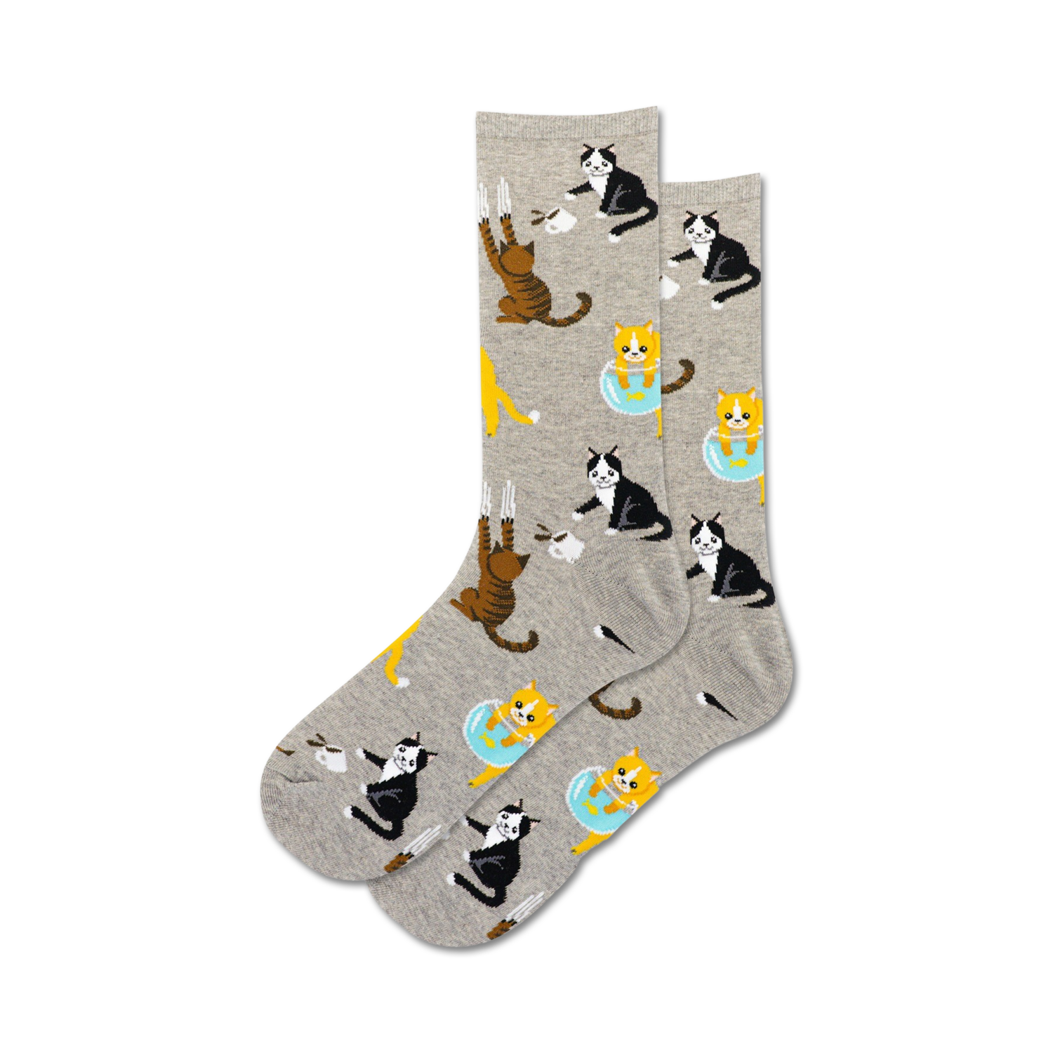 Cloaked in the stealthy gray of a twilight prowler, these crew socks feature a gang of furry anarchists in black, white, orange, and tabby. Watch them enact their cunning plans—whether it's executing a perfect scratch maneuver, masterminding a mug-toppling heist, or embarking on a covert fishbowl mission. Perfect for those who admire the rebel spirit of our whiskered companions, these socks are your secret to walking on the wild side of comfort without ever causing a cat-astrophe. Embrace the chaos—quietly, cozily, catastrophically cat.