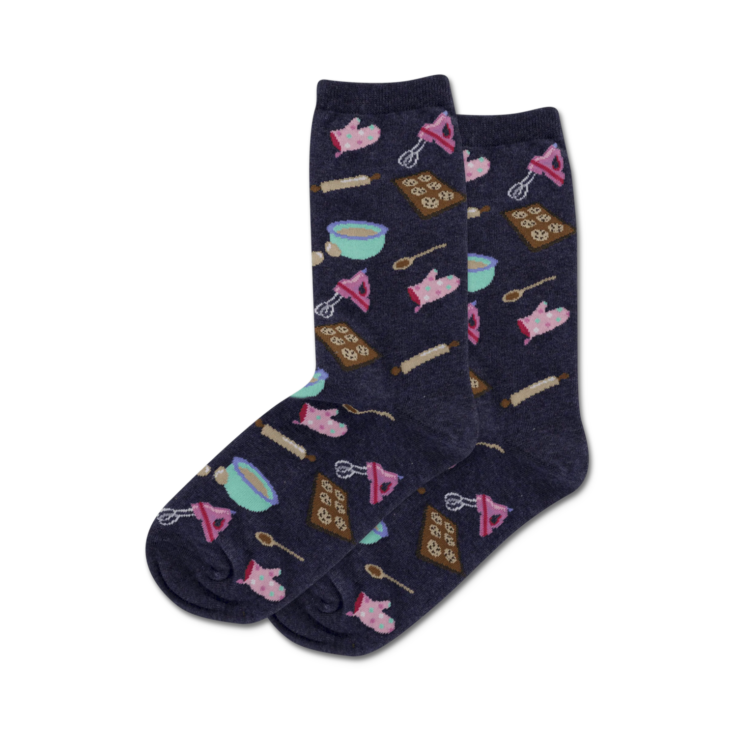 Measuring spoons, rolling pins, and oven mitts adorn these tubular treats! Picture yourself baking up a storm while rocking these socks with a pair of your favorite chocolate chip cookies. These socks are the perfect accessory for any baker looking to add a touch of fun and whimsy to their outfit. They're also a great conversation starter!