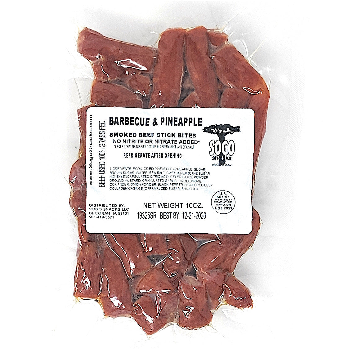 Ingredients: Pork, dried pineapple, brown sugar, water, sea salt, sweetener (cane sugar, honey), encapsulated citric acid, celery juice powder, ground mustard, granulated garlic, coriander, onion powder, black pepper, in naturally colored beef collagen casings.
