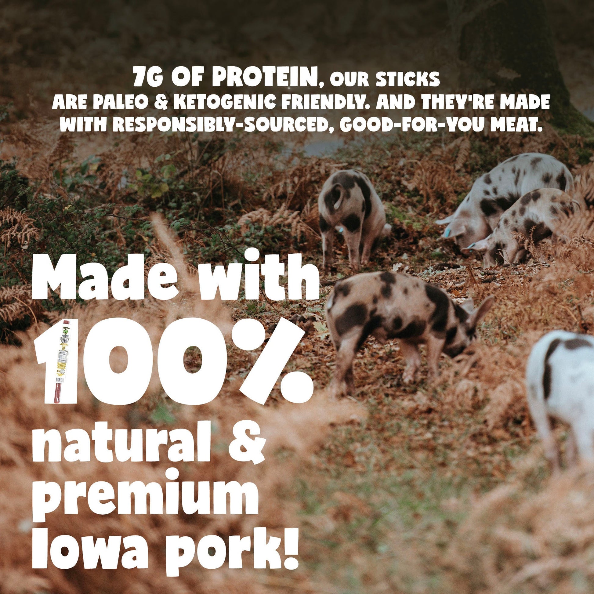 Our Pork Sticks are made from lean cuts of tender, farm fresh pork and seasoned with an award-winning herb and spice blend. They are slow hickory wood smoked creating a snack you'll love and feel good about eating: