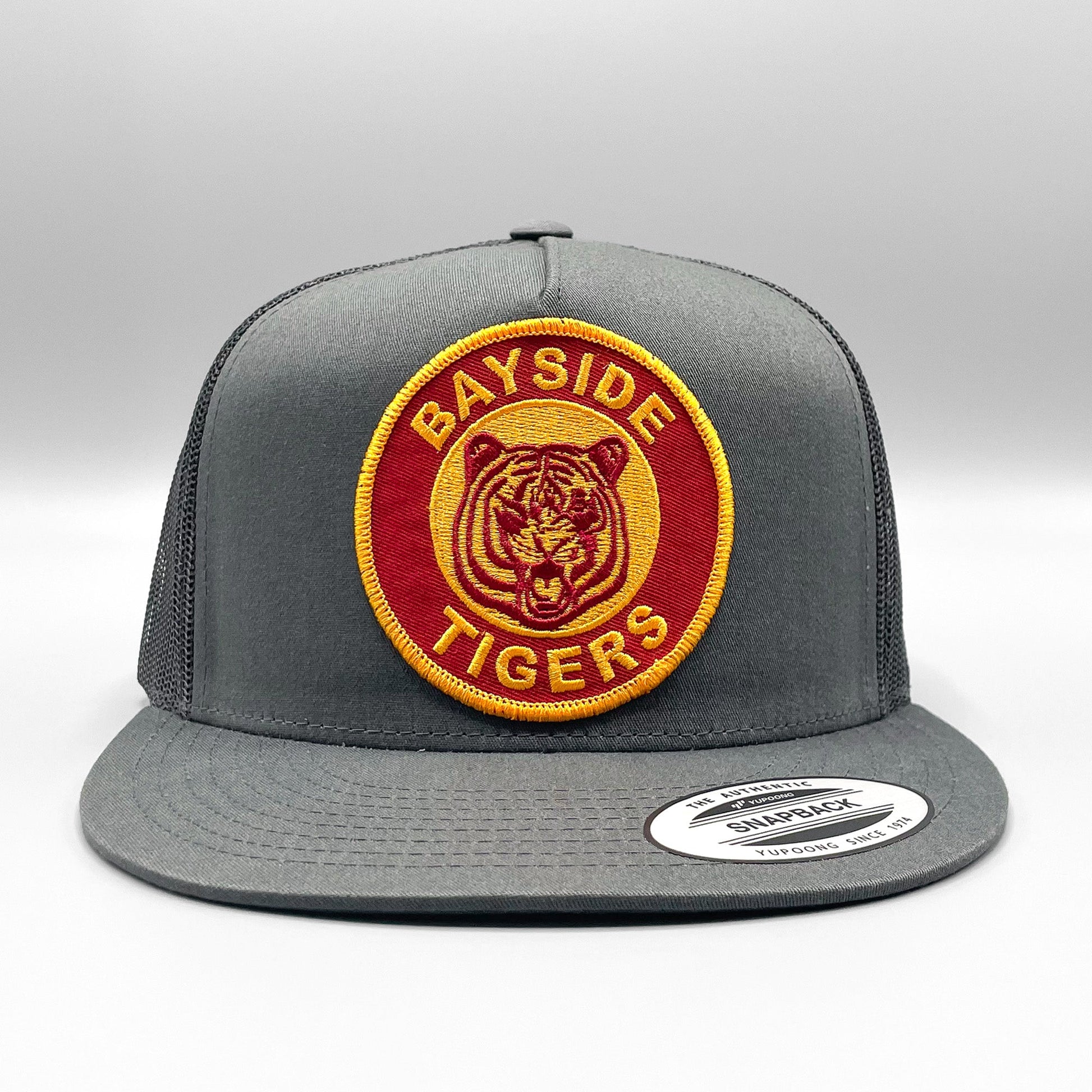This listing is for retro Bayside High School Tigers embroidered patch on one of our best-selling (and best fitting) baseball style trucker hats -- a charcoal gray Yupoong 6006 Classic mesh snapback trucker hat. If you're a fan of Zach, Jessie, Screech, Kelly and Slater (and Mr. Belding of course) from the famous 90's TV show, this is the hat for you.