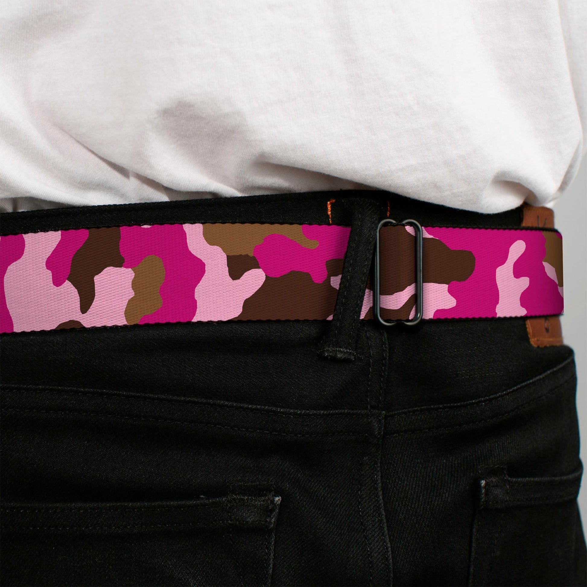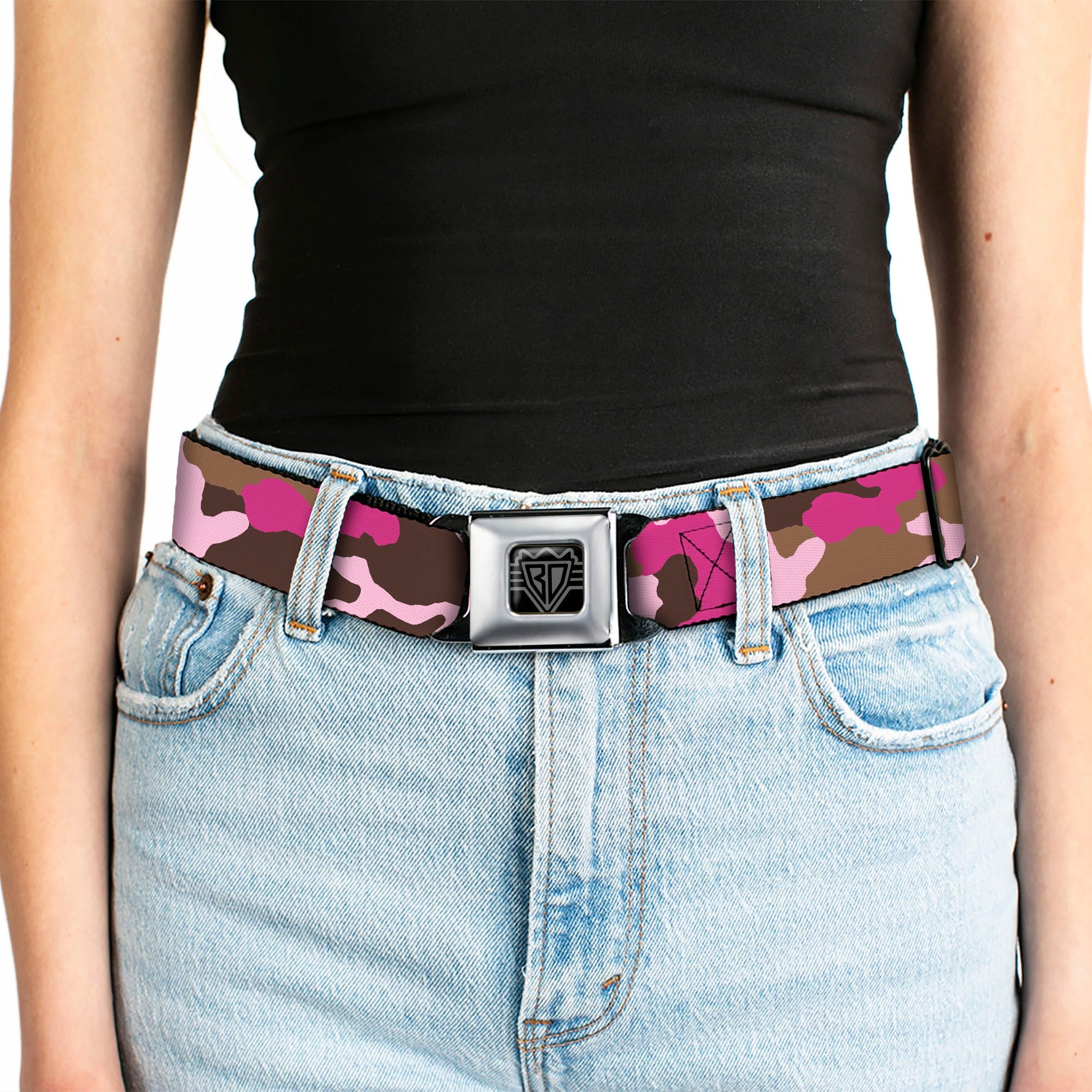 BD Wings Logo CLOSE-UP Full Color Black Silver Seatbelt Belt - Camo Pink Webbing
