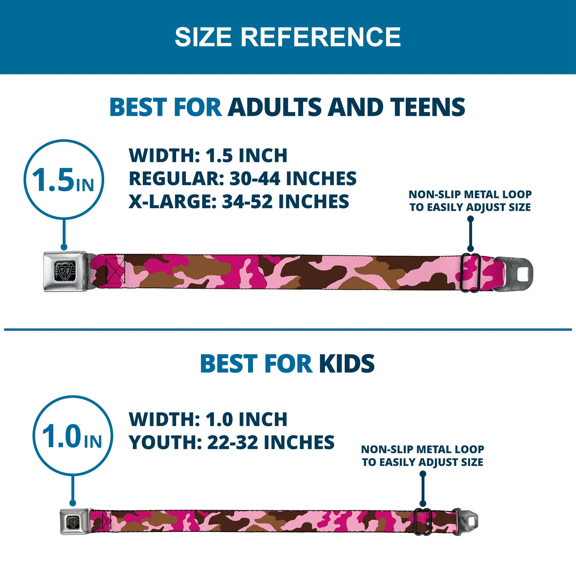- Our adult-size Seatbelt Belts are 1.5 inches wide and our kid-sized Seatbelt Belts are 1.0 inch wide.