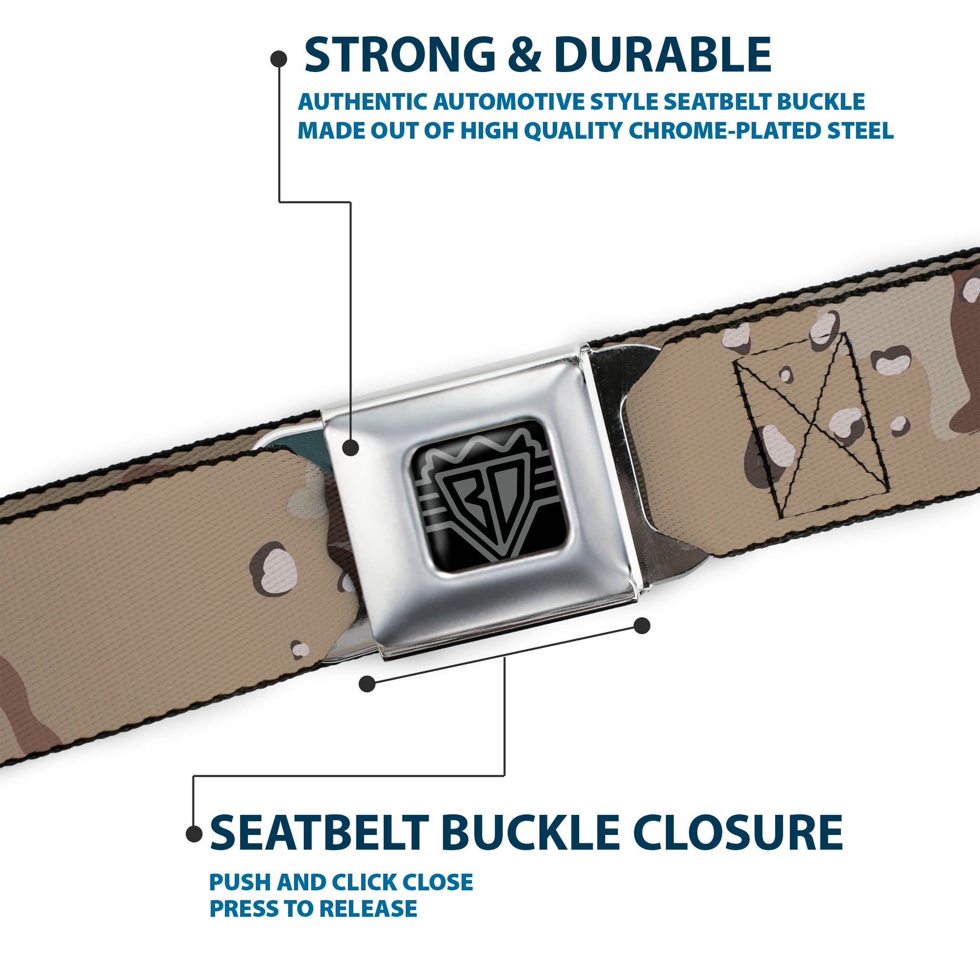 BD Wings Logo CLOSE-UP Full Color Black Silver Seatbelt Belt - Desert Camo Tans/Browns Webbing