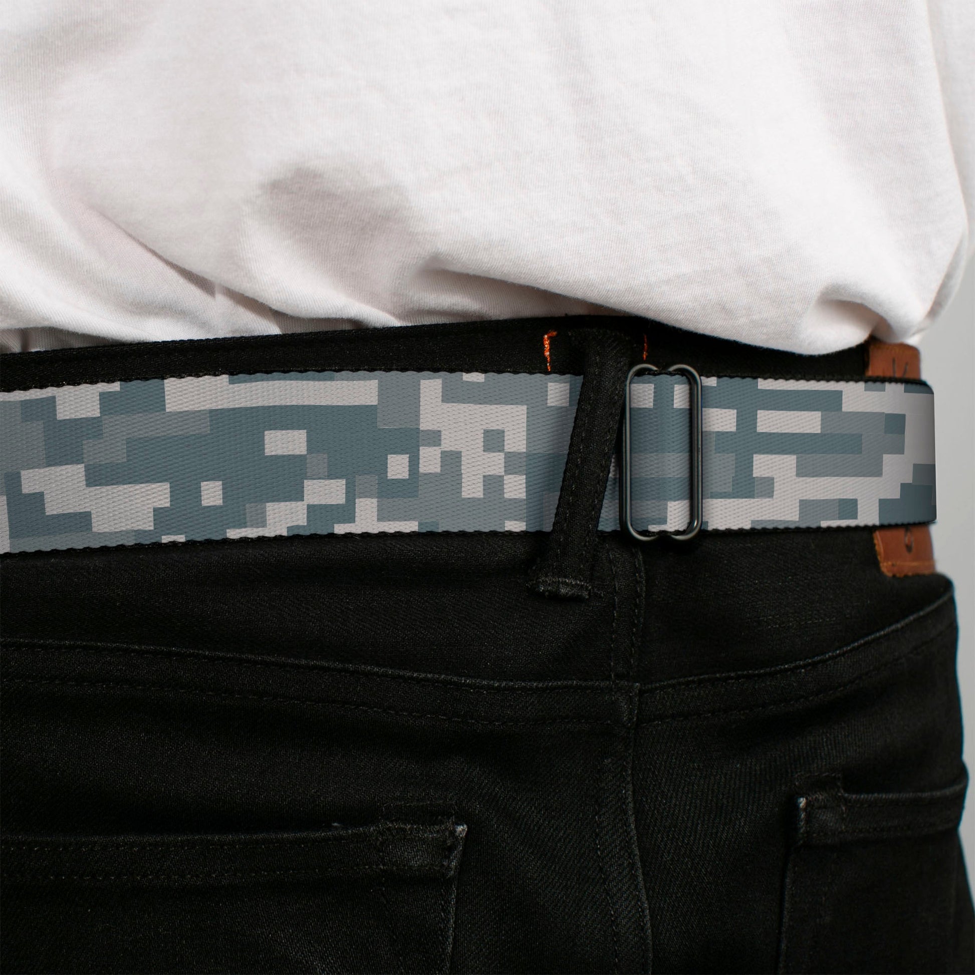 BD Wings Logo CLOSE-UP Full Color Black Silver Seatbelt Belt - Digital Camo2 Grays Webbing