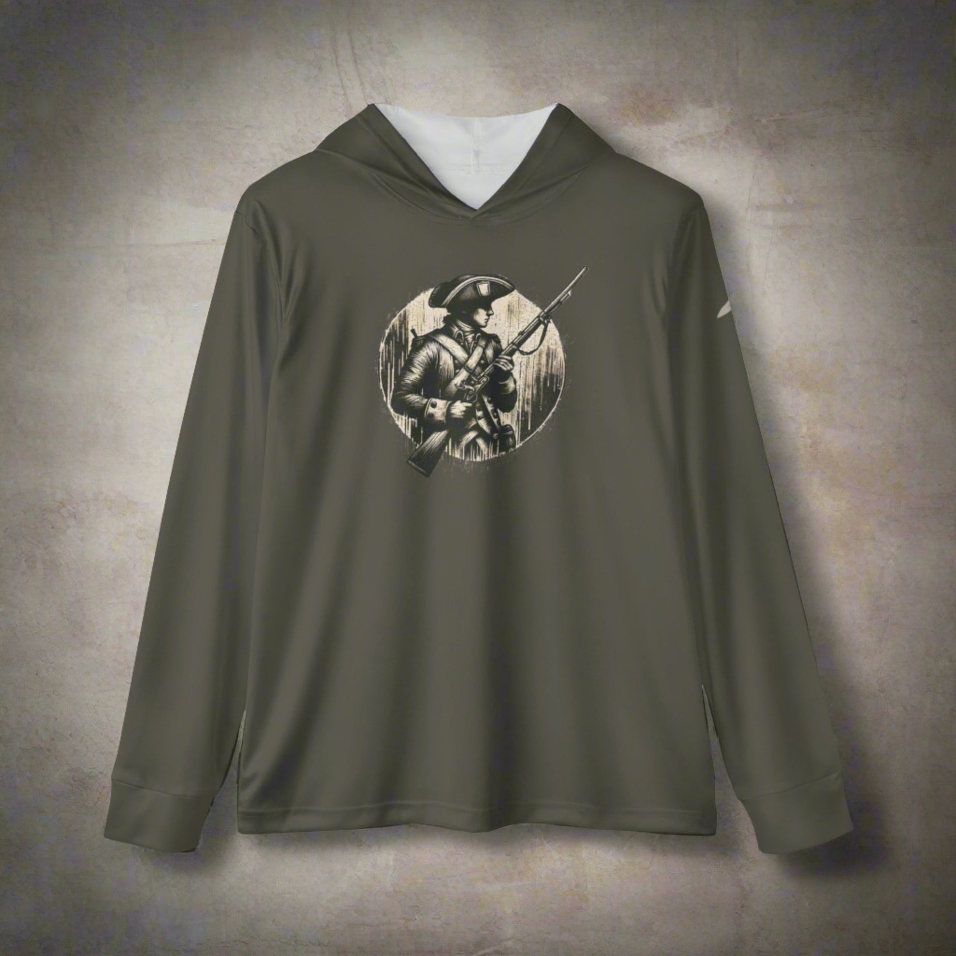 The "Be Revolutionary" summer-weight warmup hoodie features a striking, vintage-style illustration of a determined Revolutionary War soldier, musket in hand, ready to defend the cause of liberty. This design captures the rugged spirit and steadfast courage of the American Revolution, making it a perfect statement piece for patriots who honor the nation's fight for independence. Wear this shirt to showcase your appreciation for history and the timeless values of freedom and bravery. Stand out, be bold, and embrace your revolutionary spirit with this unique and powerful summer hoodie.