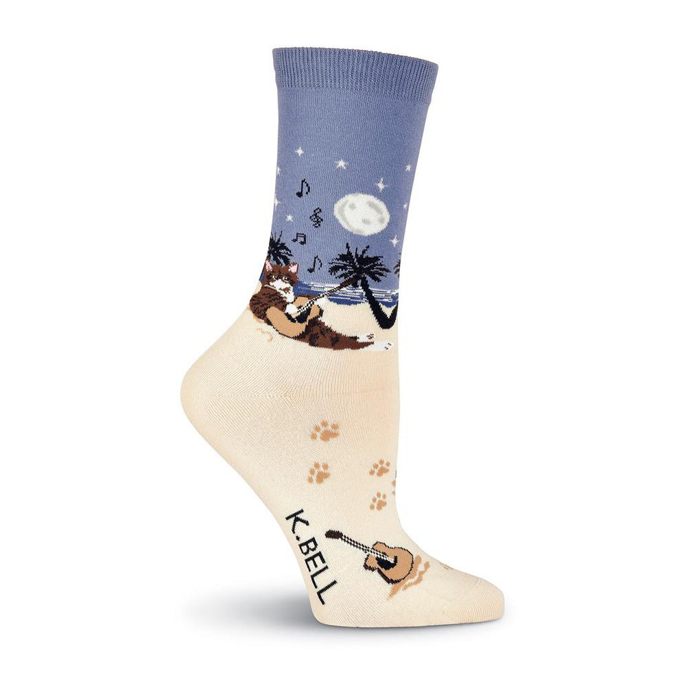 These 'Beach Cat' socks are pretty chill. The top part is a dusky blue with a nighttime scene: a full moon, stars, palm trees, and musical notes. A cat is shown strumming a guitar on a sandy beach below. The bottom of the sock is a creamy off-white with tiny paw prints. It's a fun design, perfect for adding a little playful whimsy to your day.
