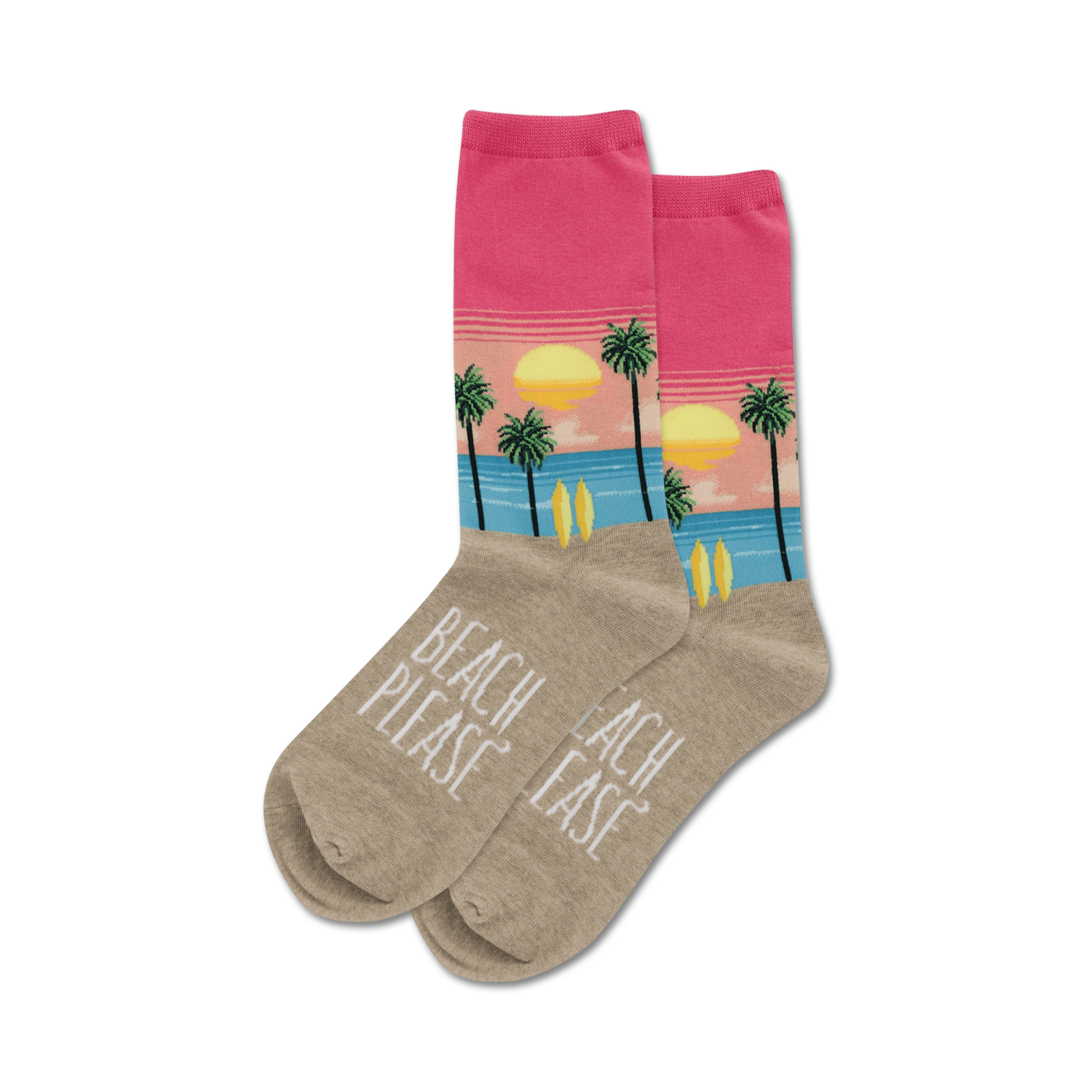 Dig your toes into a pair of our funky Beach Please socks and let your feet soak up the sunset. Summer vibes never go out of style, and with these crew-length socks, who cares what day it is? The bright, colorful palm tree design will make you feel like you're sipping a drink on the beach, even if you're just stuck in the office. Plus, the words "BEACH PLEASE" let everyone know that you're not afraid to show off your fun side.