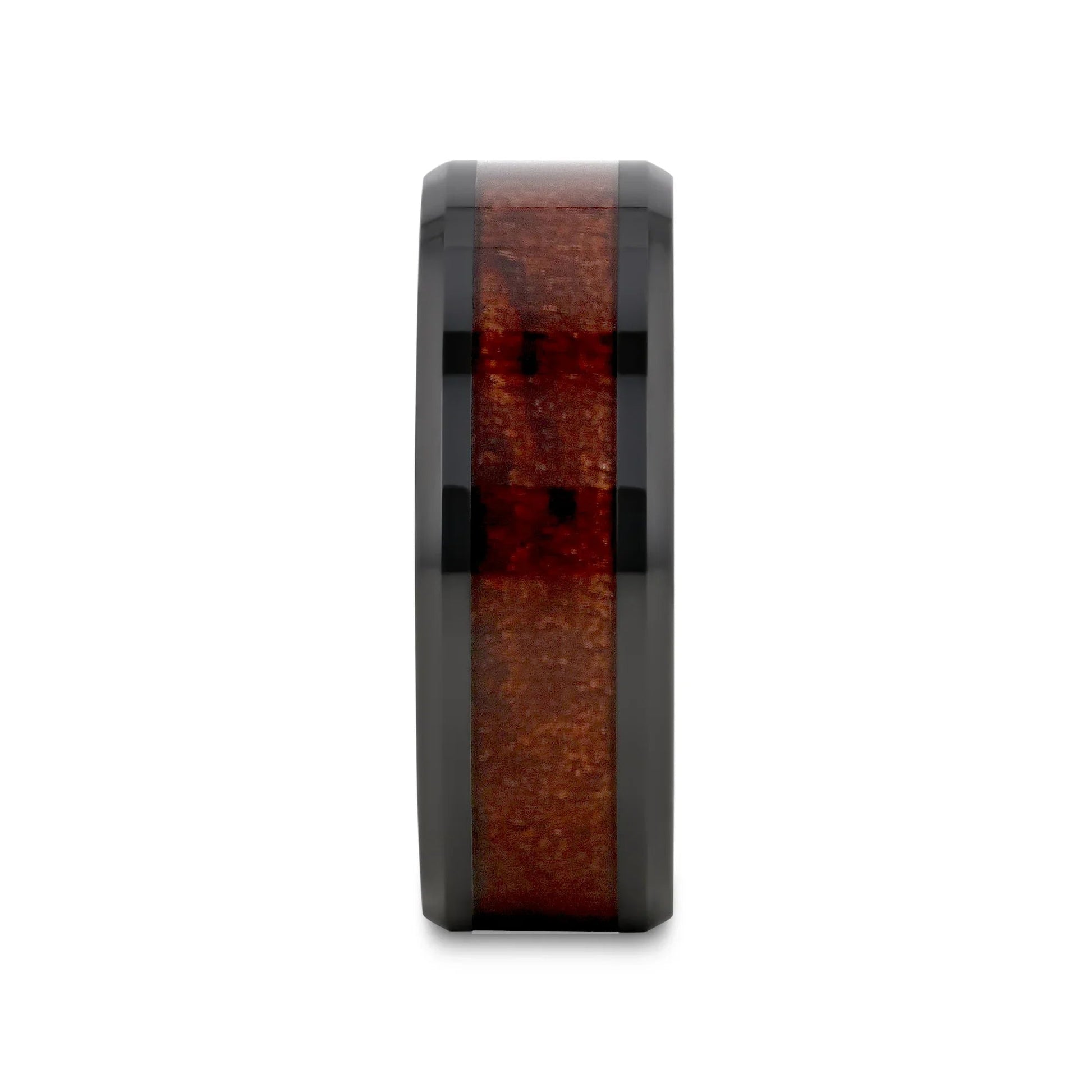 BENNY Black Ceramic Polished Beveled Edges Men’s Wedding Band with Bubinga Wood Inlay - 8mm